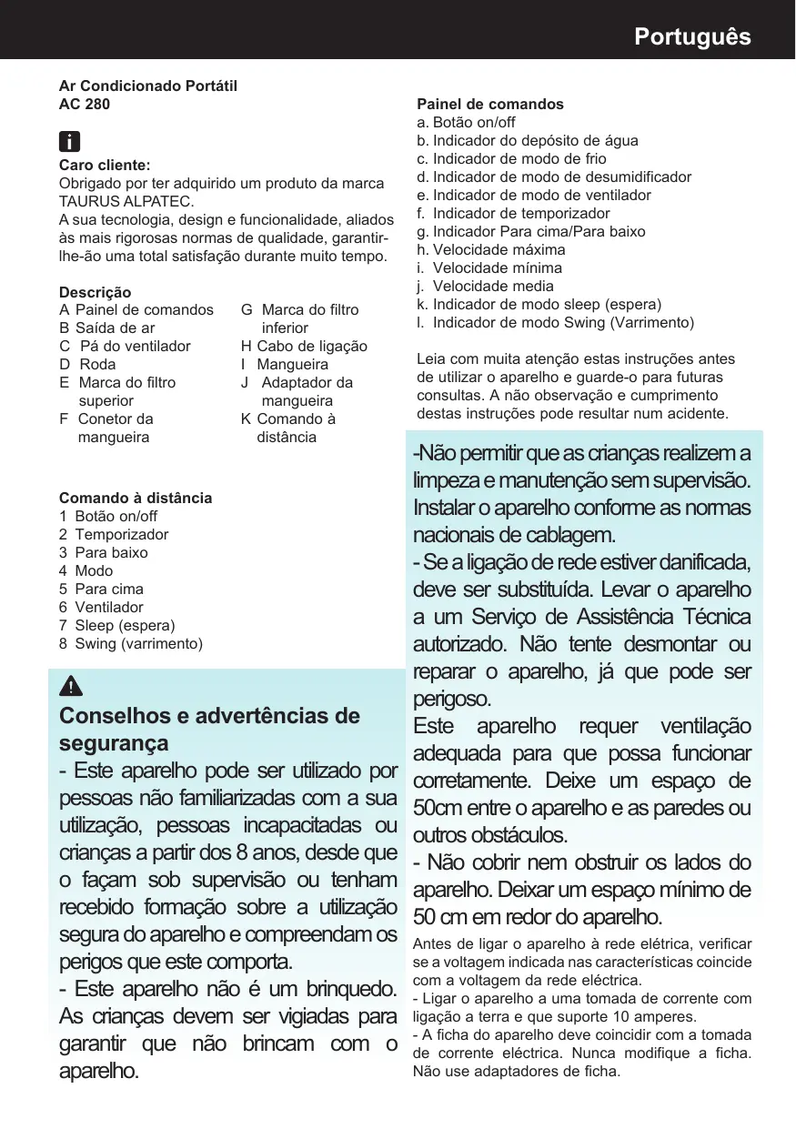 ELÉTRICO EM ÁGUA OU EM QUALQUER OUTRO LÍQUIDO. - Limpar o aparelho com um pano húmido com algumas gotas de detergente. Não utilizar solventes, produtos com um factor pH ácido ou básico como a lixívia nem produtos abrasivos para a limpeza do aparelho. - Não submergir o conector em água ou em qualquer outro líquido, nem o colocar debaixo da torneira. Se o aparelho não se mantiver limpo, a sua superfície pode degradar-se e afectar de forma inexorável a duração da vida do aparelho e conduzir a uma situação de perigo. Limpeza do filtro de ar - Limpe os filtros de ar cada 2 semanas. Se o filtro de ar estiver bloqueado com pó, a sua eficiência diminuirá. - Extrair o filtro para cima e para baixo como nas imagens que se seguem. Lave os filtros de ar submergindo-os cuidadosamente em água quente com um detergente neutro, enxagúe-os e deixe-os secar completamente num local à sombra. - Instale os filtros cuidadosamente após estarem limpos. Pós Manutenção Periódica - Desligue a ficha do depósito de enchimento e esvazie o recipiente de água, verta a água inclinando o recipiente, depois mude o modo do aparelho para o modo de ventilador e prima o botão até a velocidade do ventilador ficar baixa. - Manter este modo durante meio dia até que o tubo fique seco. Deste modo, o tubo mantém-se seco e não apanhará humidade. - Desligue o aparelho e retire a ficha da tomada. - Enrole o cabo, una-o e depois guarde-o no local dos acessórios. - Separe o tubo de escape do ar e guarde-o cuidadosamente. - Coloque o aparelho num saco de plástico e guarde-o num local seco. - Remova as pilhas do comando à distância e guarde-as cuidadosamente. Anomalias e reparação - Em caso de avaria, leve o aparelho a um Serviço de Assistência Técnica autorizado. Não tente Português desmontar ou reparar o aparelho, já que pode ser perigoso. No caso de detectar algum problema, consulte a seguinte tabela: Anomalias Se o aparelho não funciona Causas Soluções - Se não há corrente. - Ligue o aparelho - Indicador do depósito de água aceso - Verta a água do interior do recipiente Aparentemente o aparelho não funciona - Luz solar indireta - Janelas ou portas abertas - O filtro está muito sujo - A entrada ou saída de ar está bloqueada. - A temperatura da divisão é inferior à selecionada. - Abra as cortinas - Feche as janelas ou ligue outro ar condicionado - Limpe ou mude o filtro de ar - Limpe o depósito - Mude a seleção da temperatura O aparelho faz demasiado ruído - O aparelho não está sobre uma superfície plana - Colocar o aparelho numa superfície plana que suporte o seu peso O compressor não funciona - A proteção contra o sobreaquecimento está ativada - Ligue o aparelho três minutos após a temperatura ter diminuído Para produtos da União Europeia e/ou conforme os requisitos da regulamentação do seu país de origem: Ecologia e reciclabilidade do produto: Os materiais que formam a embalagem deste aparelho estão submetidos a um sistema de recolha, classificação e reciclagem dos mesmos (Ponto Verde). Se deseja eliminá-los, utilize os contentores colocados à disposição para cada tipo de material. - O produto está isento de concentrações de substâncias que podem ser consideradas nocivas para o ambiente. - Este símbolo significa que caso se pretenda eliminar o produto, no seu fim de vida útil, dever-se-á entregá-lo a um gestor de resíduos autorizados para a recolha selectiva de Resíduos de Equipamentos Eléctricos e Electrónicos (REEE). Este aparelho cumpre a Directiva 2014/35/EC de Baixa Tensão, a Directiva 2014/30/EC de Compatibilidade Electromagnética, a Directiva 2011/65/CE sobre restrições à utilização de determinadas substâncias perigosas em aparelhos eléctricos e electrónicos. English Portable Air Conditioner AC 280 Dear customer, Many thanks for choosing to purchase a TAURUS ALPATEC brand product. Thanks to its technology, design and operation and the fact that it exceeds the strictest quality standards, a fully satisfactory use and long product life can be assured. Description A Control panel B Air outlet C Fan blade D Castor wheels E Filter frame upper F Exhaust connector G Filter frame lower H Power cord I Exhaust hose J Slide bar connector K Remote control (Batteries not included) Remote control 1 On/Off 2 Timer 3 Down 4 Mode 5 Up 6 Fan 7 Sleeping 8 Swing Safety advice and warnings - This appliance can be used by children aged from 8 years and above and persons with reduced physical, sensory or mental capabilities or lack of experience and knowledge if they have been given supervision or instruction concerning use of the appliance in a safe way and understand the hazards involved. - This appliance is not a toy. Children should be supervised to ensure that they do not play with the appliance. - Cleaning and user maintenance shall Panel Control a. Power indicator b. Water full indicator c. Cool indicator mode d. Dehumidifier indicator mode e. Fan indicator mode f. Timer indicator g. Up/ down indicator h. High speed indicator