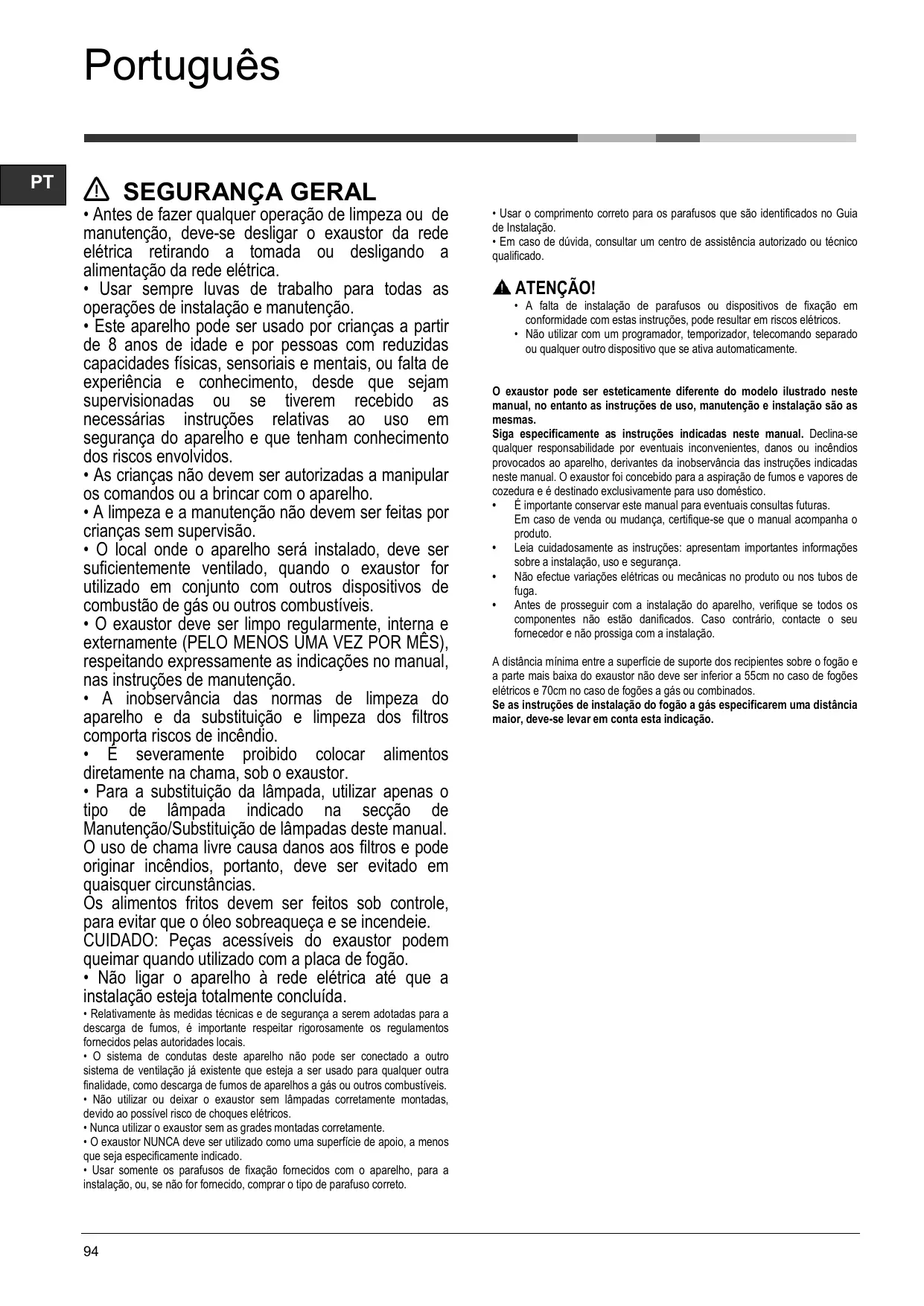 • Les enfants ne doivent pas jouer avec l’appareil. • Le nettoyage et l’entretien par l’usager ne doivent pas être effectués par des enfants sans surveillance. • La pièce doit avoir une aération suffisante lorsque la hotte est utilisée conjointement avec d'autres appareils fonctionnant au gaz ou autres combustibles. • La hotte doit être régulièrement nettoyée à la fois à l'intérieur et à l'extérieur (AU MOINS UNE FOIS PAR MOIS); cela devrait se faire en conformité avec les instructions d'entretien. Le non respect des instructions expressément fournies concernant le nettoyage de la hotte et des filtres peut provoquer des risques d'incendie. • Ne pas flamber d’aliments sous la hotte. • Pour le remplacement de la lampe, utilisez uniquement le type de lampe spécifié dans la section remplacement/maintenance lampe dans ce manuel. L'utilisation d'une flamme nue est dommageable pour les filtres et peut causer un incendie, par conséquent, il est déconseillé de l'utiliser. La friture doit être faite avec soin afin de s’assurer que l’huile surchauffée ne prenne pas feu. AVERTISSEMENT: Lorsque la table de cuisson est en fonctionnement, les parties accessibles de la hotte peuvent devenir très chaudes. • Ne pas brancher l'appareil au réseau électrique avant que l'installation ne soit complètement terminée. • En ce qui concerne les mesures techniques et de sécurité à prendre pour l'évacuation des fumées, respectez strictement les dispositions des règlements locales. • L’air ne doit pas être envoyé dans un conduit utilisé pour évacuer les fumées d’appareils utilisant du gaz ou un autre combustible. • Ne pas utiliser ou laisser la hotte sans les lampes correctement montées, car un éventuel risque de choc électrique est possible. • N’utilisez jamais la hotte sans la grille montée correctement! • La hotte ne doit JAMAIS être utilisée comme une surface d'appui, sauf indication expresse. • Utilisez uniquement les vis de fixation fournies avec le produit pour l'installation, ou, si non fournies, acheter le type correct de vis. • Utilisez la longueur correcte pour les vis qui sont identifiées dans le Guide d'installation.