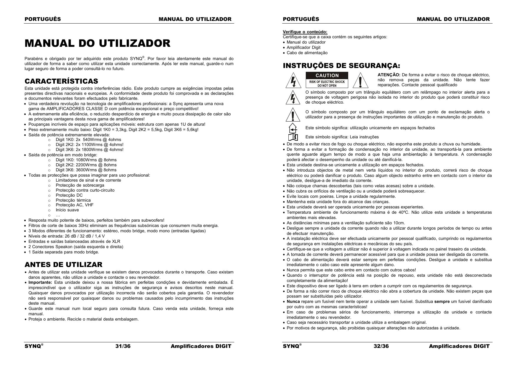 Antes de utilizar esta unidade verifique se existem danos provocados durante o transporte. Caso existam danos aparentes, não utilize a unidade e contacte o seu revendedor. Importante: Esta unidade deixou a nossa fábrica em perfeitas condições e devidamente embalada. É imprescindível que o utilizador siga as instruções de segurança e avisos descritos neste manual. Quaisquer danos provocados por utilização incorrecta não serão cobertos pela garantia. O revendedor não será responsável por quaisquer danos ou problemas causados pelo incumprimento das instruções deste manual. Guarde este manual num local seguro para consulta futura. Caso venda esta unidade, forneça este manual. Proteja o ambiente. Recicle o material desta embalagem. SYNQ® 31/36 Amplificadores DIGIT ATENÇÃO: De forma a evitar o risco de choque eléctrico, não remova peças da unidade. Não tente fazer reparações. Contacte pessoal qualificado O símbolo composto por um triângulo equilátero com um relâmpago no interior alerta para a presença de voltagem perigosa não isolada no interior do produto que poderá constituir risco de choque eléctrico. O símbolo composto por um triângulo equilátero com um ponto de exclamação alerta o utilizador para a presença de instruções importantes de utilização e manutenção do produto. Este símbolo significa: utilização unicamente em espaços fechados Este símbolo significa: Leia instruções De modo a evitar risco de fogo ou choque eléctrico, não exponha este produto a chuva ou humidade. De forma a evitar a formação de condensação no interior da unidade, ao transportá-la para ambiente quente aguarde algum tempo de modo a que haja uma ambientação à temperatura. A condensação poderá afectar o desempenho da unidade ou até danificá-la. Esta unidade destina-se unicamente a utilização em espaços fechados. Não introduza objectos de metal nem verta líquidos no interior do produto, correrá risco de choque eléctrico ou poderá danificar o produto. Caso algum objecto estranho entre em contacto com o interior da unidade, desligue-a de imediato da corrente. Não coloque chamas descobertas (tais como velas acesas) sobre a unidade. Não cubra os orifícios de ventilação ou a unidade poderá sobreaquecer. Evite locais com poeiras. Limpe a unidade regularmente. Mantenha esta unidade fora do alcance das crianças. Esta unidade deverá ser operada unicamente por pessoas experientes. Temperatura ambiente de funcionamento máxima é de 40ºC. Não utilize esta unidade a temperaturas ambientes mais elevadas. As distâncias mínimas para a ventilação suficiente são 10cm. Desligue sempre a unidade da corrente quando não a utilizar durante longos períodos de tempo ou antes de efectuar manutenção. A instalação eléctrica deve ser efectuada unicamente por pessoal qualificado, cumprindo os regulamentos de segurança em instalações eléctricas e mecânicas do seu país. Certifique-se que a voltagem a utilizar não é superior à voltagem indicada no painel traseiro da unidade. A tomada de corrente deverá permanecer acessível para que a unidade possa ser desligada da corrente. O cabo de alimentação deverá estar sempre em perfeitas condições. Desligue a unidade e substitua imediatamente o cabo caso este apresente algum dano. Nunca permita que este cabo entre em contacto com outros cabos! Quando o interruptor de potência está na posição de repouso, esta unidade não está desconectada completamente da alimentação! Este dispositivo deve ser ligado à terra em ordem a cumprir com os regulamentos de segurança. De forma a não correr risco de choque eléctrico não abra a cobertura da unidade. Não existem peças que possam ser substituídas pelo utilizador. Nunca repare um fusível nem tente operar a unidade sem fusível. Substitua sempre um fusível danificado por outro com as mesmas características! Em caso de problemas sérios de funcionamento, interrompa a utilização da unidade e contacte imediatamente o seu revendedor. Caso seja necessário transportar a unidade utilize a embalagem original. Por motivos de segurança, são proibidas quaisquer alterações não autorizadas à unidade. SYNQ® 32/36 Amplificadores DIGIT PORTUGUÊS