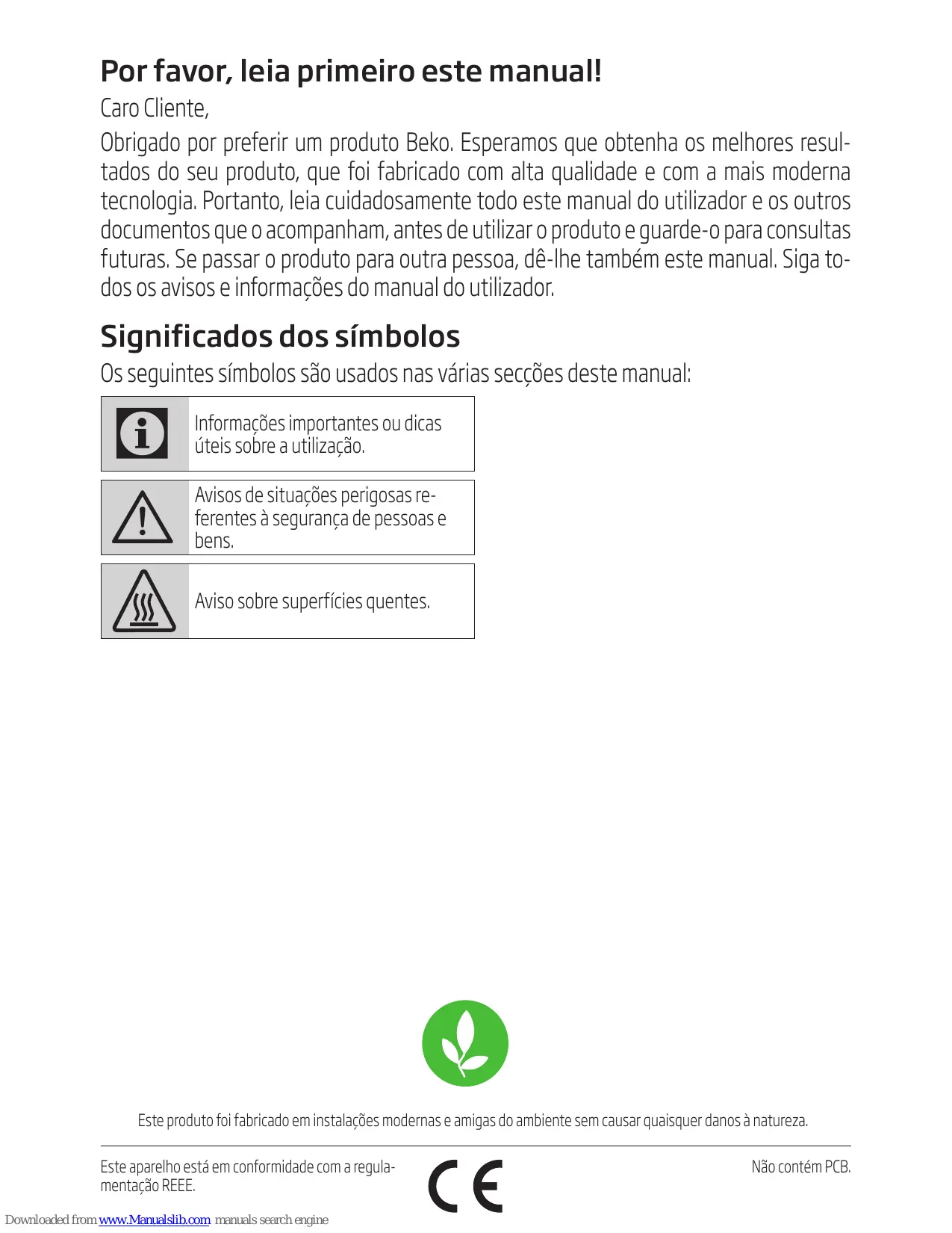 Informações importantes ou dicas úteis sobre a utilização. Avisos de situações perigosas referentes à segurança de pessoas e bens. Aviso sobre superfícies quentes. Este produto foi fabricado em instalações modernas e amigas do ambiente sem causar quaisquer danos à natureza. Este aparelho está em conformidade com a regulamentação REEE. Downloaded from www.Manualslib.com manuals search engine Não contém PCB. ÍNDICE 1 Instruções importantes sobre a segurança e ambiente