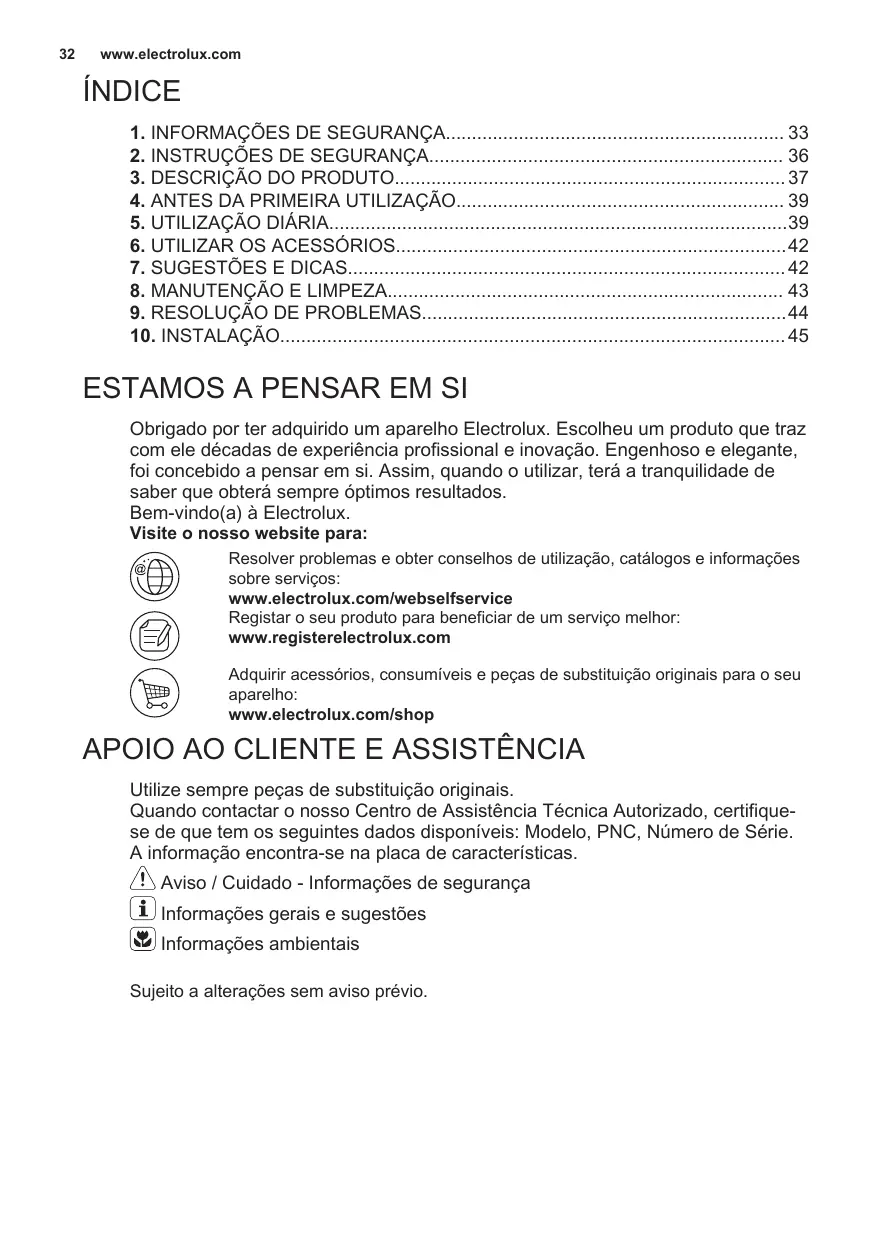Resolver problemas e obter conselhos de utilização, catálogos e informações sobre serviços: www.electrolux.com/webselfservice Registar o seu produto para beneficiar de um serviço melhor: www.registerelectrolux.com Adquirir acessórios, consumíveis e peças de substituição originais para o seu aparelho: www.electrolux.com/shop