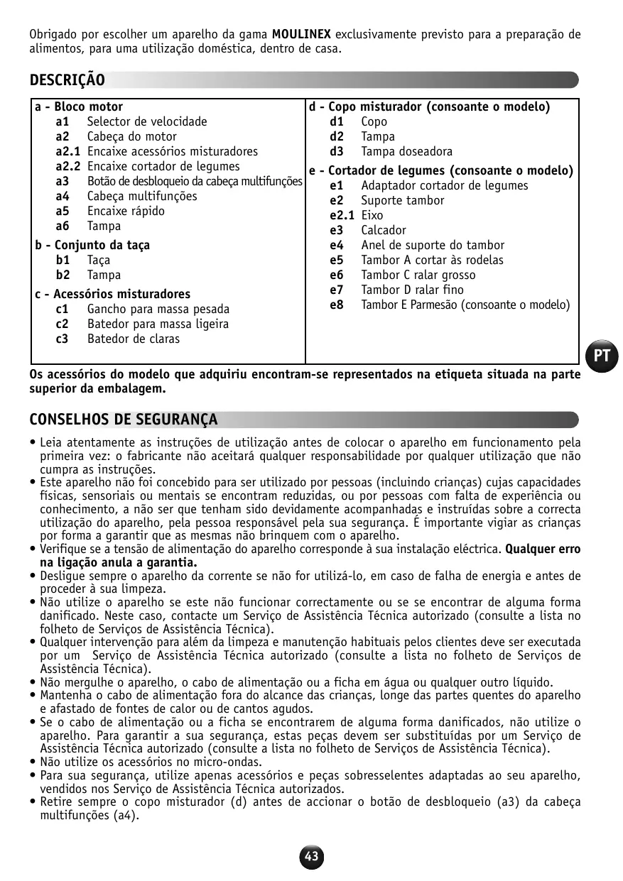 CONSELHOS DE SEGURANÇA • Leia atentamente as instruções de utilização antes de colocar o aparelho em funcionamento pela primeira vez: o fabricante não aceitará qualquer responsabilidade por qualquer utilização que não cumpra as instruções. • Este aparelho não foi concebido para ser utilizado por pessoas (incluindo crianças) cujas capacidades físicas, sensoriais ou mentais se encontram reduzidas, ou por pessoas com falta de experiência ou conhecimento, a não ser que tenham sido devidamente acompanhadas e instruídas sobre a correcta utilização do aparelho, pela pessoa responsável pela sua segurança. É importante vigiar as crianças por forma a garantir que as mesmas não brinquem com o aparelho. • Verifique se a tensão de alimentação do aparelho corresponde à sua instalação eléctrica. Qualquer erro na ligação anula a garantia. • Desligue sempre o aparelho da corrente se não for utilizá-lo, em caso de falha de energia e antes de proceder à sua limpeza. • Não utilize o aparelho se este não funcionar correctamente ou se se encontrar de alguma forma danificado. Neste caso, contacte um Serviço de Assistência Técnica autorizado (consulte a lista no folheto de Serviços de Assistência Técnica). • Qualquer intervenção para além da limpeza e manutenção habituais pelos clientes deve ser executada por um Serviço de Assistência Técnica autorizado (consulte a lista no folheto de Serviços de Assistência Técnica). • Não mergulhe o aparelho, o cabo de alimentação ou a ficha em água ou qualquer outro líquido. • Mantenha o cabo de alimentação fora do alcance das crianças, longe das partes quentes do aparelho e afastado de fontes de calor ou de cantos agudos. • Se o cabo de alimentação ou a ficha se encontrarem de alguma forma danificados, não utilize o aparelho. Para garantir a sua segurança, estas peças devem ser substituídas por um Serviço de Assistência Técnica autorizado (consulte a lista no folheto de Serviços de Assistência Técnica). • Não utilize os acessórios no micro-ondas. • Para sua segurança, utilize apenas acessórios e peças sobresselentes adaptadas ao seu aparelho, vendidos nos Serviço de Assistência Técnica autorizados. • Retire sempre o copo misturador (d) antes de accionar o botão de desbloqueio (a3) da cabeça multifunções (a4). 43