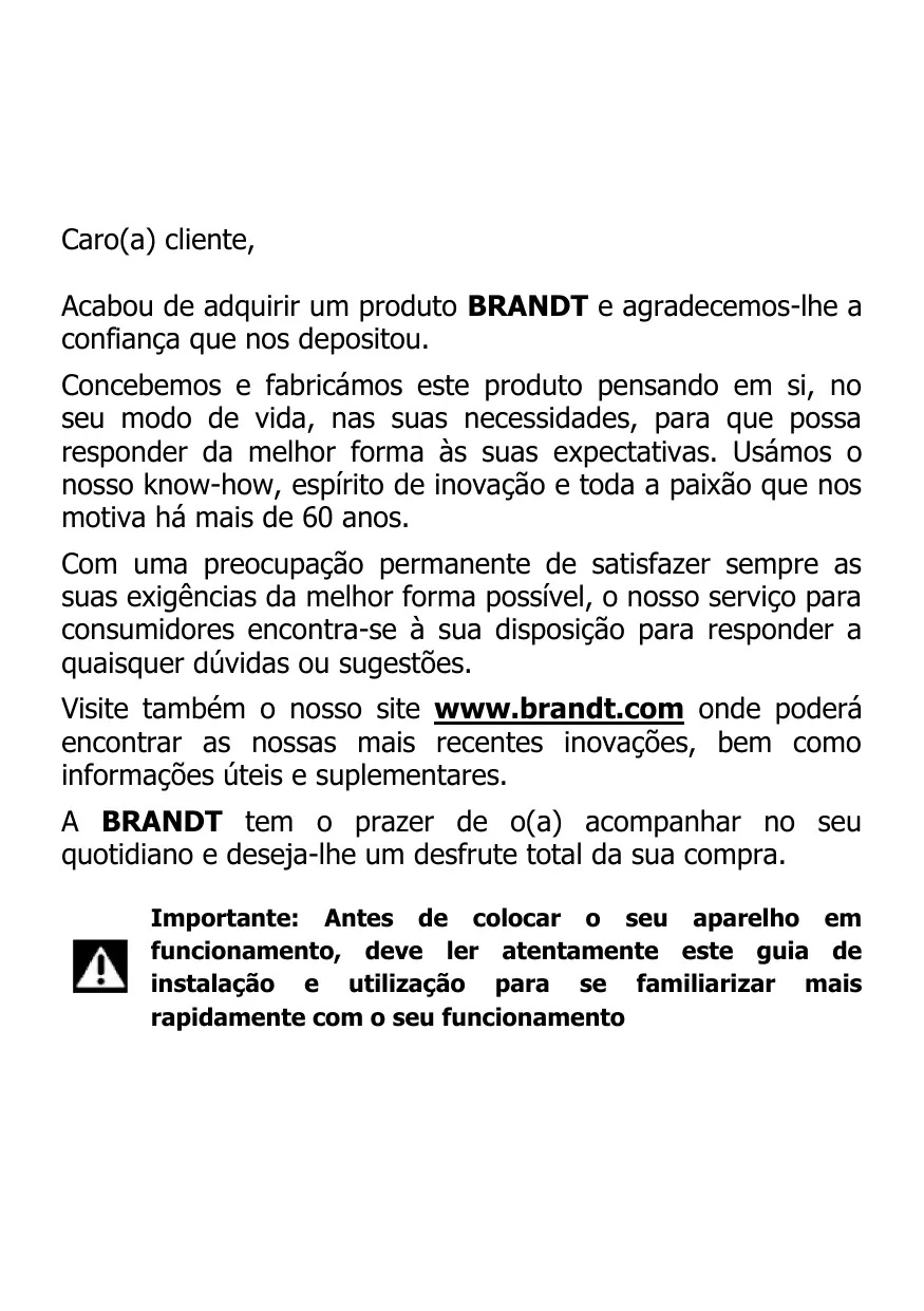 Caro(a) cliente, Acabou de adquirir um produto BRANDT e agradecemos-lhe a confiança que nos depositou. Concebemos e fabricámos este produto pensando em si, no seu modo de vida, nas suas necessidades, para que possa responder da melhor forma às suas expectativas. Usámos o nosso know-how, espírito de inovação e toda a paixão que nos motiva há mais de 60 anos. Com uma preocupação permanente de satisfazer sempre as suas exigências da melhor forma possível, o nosso serviço para consumidores encontra-se à sua disposição para responder a quaisquer dúvidas ou sugestões. Visite também o nosso site www.brandt.com onde poderá encontrar as nossas mais recentes inovações, bem como informações úteis e suplementares. A BRANDT tem o prazer de o(a) acompanhar no seu quotidiano e deseja-lhe um desfrute total da sua compra. Importante: Antes de colocar o seu aparelho em funcionamento, deve ler atentamente este guia de instalação e utilização para se familiarizar mais rapidamente com o seu funcionamento