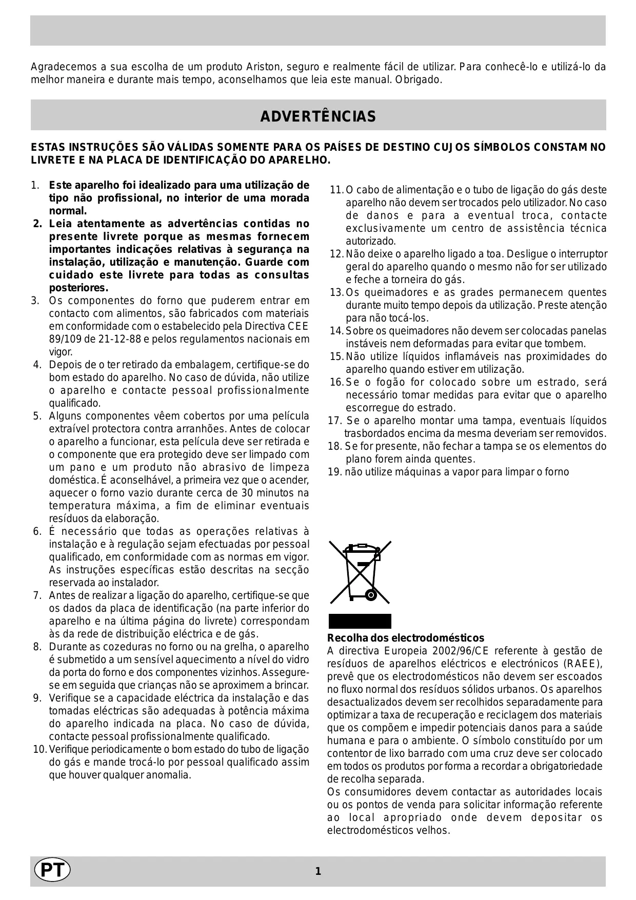 Ventilado Agradecemos a sua escolha de um produto Ariston, seguro e realmente fácil de utilizar. Para conhecê-lo e utilizá-lo da melhor maneira e durante mais tempo, aconselhamos que leia este manual. Obrigado. ADVERTÊNCIAS ESTAS INSTRUÇÕES SÃO VÁLIDAS SOMENTE PARA OS PAÍSES DE DESTINO CUJOS SÍMBOLOS CONSTAM NO LIVRETE E NA PLACA DE IDENTIFICAÇÃO DO APARELHO.