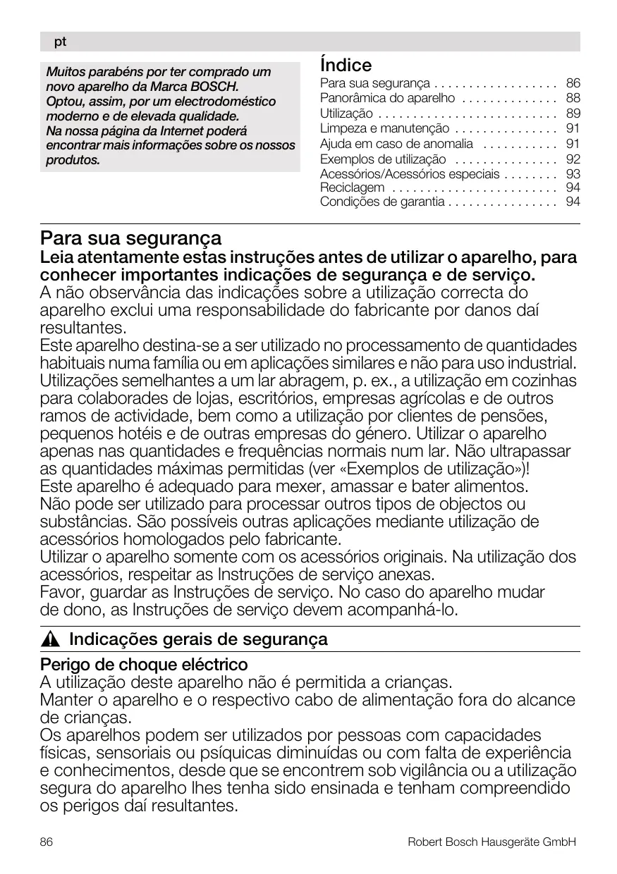 Crianças não podem brincar com o aparelho. O aparelho só deve ser ligado e utilizado de acordo com as indicações constantes da chapa de características. Utilizar o aparelho somente, se o cabo de alimentação ou o próprio aparelho não apresentarem quaisquer danos. Desligar o aparelho da corrente sempre que este não se encontre sob vigilância e antes de se proceder à sua montagem, desmontagem e limpeza. Não deixar que o cabo passe sobre arestas aguçadas nem superfícies quentes. Se o cabo de alimentação deste aparelho apresentar danos, terá que ser substituído pelo fabricante ou pelos seus Serviços Técnicos ou por um técnico devidamente qualificado para o efeito, para se evitarem situações de perigo. As reparações no aparelho devem ser executadas somente pelos nossos Serviços Técnicos. , Indicações de segurança para este aparelho Perigo de ferimentos Perigo de choque eléctrico! Só ligar a ficha à tomada, quando estiverem concluídos todos os preparativos para o trabalho com o aparelho. Nunca mergulhar o aparelho base em líquidos nem lavá-lo sob água corrente. Não utilizar aparelhos de limpeza a vapor. Não alterar a posição do braço móvel, enquanto o aparelho estiver ligado. Aguardar que o accionamento esteja completamente parado. Substituir ferramentas/acessórios só depois do accionamento completamente parado – depois de desligado, o accionamento ainda gira por inércia durante alguns momentos. Ligar e desligar o aparelho exclusivamente com o selector. Se o aparelho não estiver em utilização, deverá retirar a ficha da tomada. Antes de tentar eliminar qualquer anomalia desligue a ficha da tomada. Depois da interrupção de corrente, o aparelho volta a funcionar. Perigo de ferimentos devido a ferramentas em rotação Não tocar nas peças em rotação. Durante o funcionamento, nunca tente agarrar a tigela. Substituir qualquer ferramenta só quando o accionamento do aparelho estiver com-pletamente parada – depois de desligado, o aparelho movese, ainda, durante alguns momentos. Por razões de segurança, o aparelho só deve funcionar, se os accionamentos não utilizados estiverem cobertos com as respectivas tampas de protecção (4, 7). Robert Bosch Hausgeräte GmbH