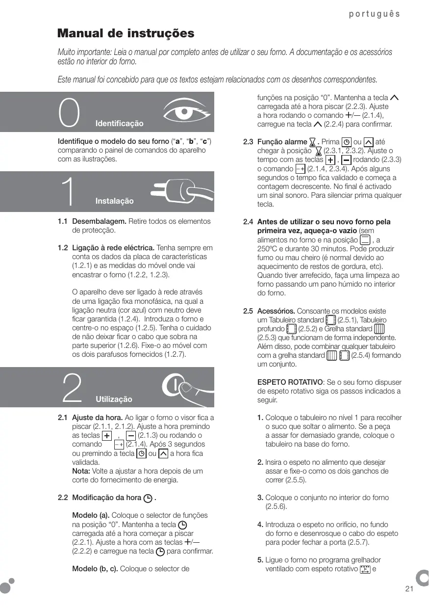 funções na posição “0”. Mantenha a tecla carregada até a hora piscar (2.2.3). Ajuste a hora rodando o comando / (2.1.4), carregue na tecla (2.2.4) para confirmar. Identificação Identifique o modelo do seu forno (“a”, “b”, “c”) comparando o painel de comandos do aparelho com as ilustrações.