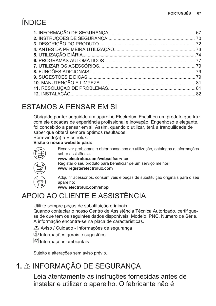 ÍNDICE 1. INFORMAÇÃO DE SEGURANÇA67 2. INSTRUÇÕES DE SEGURANÇA 70 3. DESCRIÇÃO DO PRODUTO 72 4. ANTES DA PRIMEIRA UTILIZAÇÃO 73 5. UTILIZAÇÃO DIÁRIA74 6. PROGRAMAS AUTOMÁTICOS 77 7. UTILIZAR OS ACESSÓRIOS79 8. FUNÇÕES ADICIONAIS 79 9. SUGESTÕES E DICAS 79 10. MANUTENÇÃO E LIMPEZA 81 11. RESOLUÇÃO DE PROBLEMAS81 12. INSTALAÇÃO 82