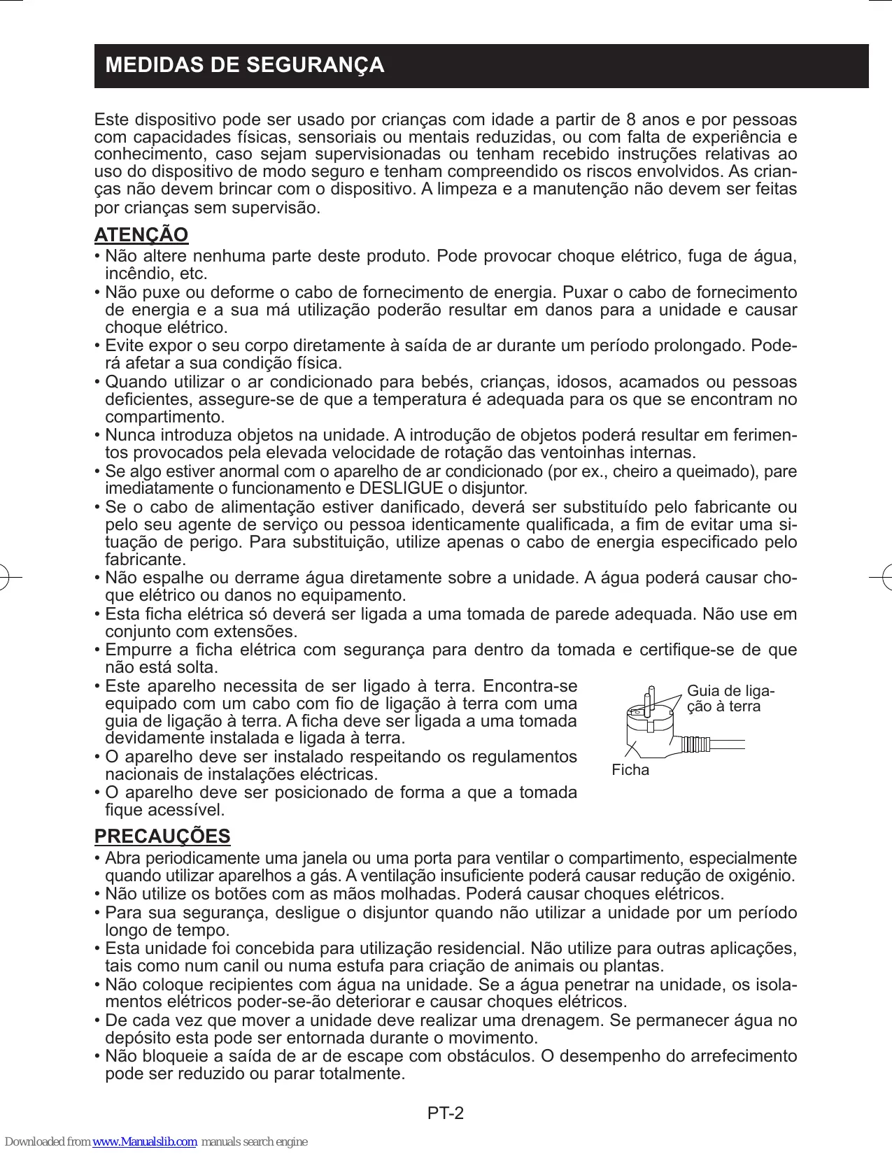 • Não altere nenhuma parte deste produto. Pode provocar choque elétrico, fuga de água, incêndio, etc. • Não puxe ou deforme o cabo de fornecimento de energia. Puxar o cabo de fornecimento de energia e a sua má utilização poderão resultar em danos para a unidade e causar choque elétrico. • Evite expor o seu corpo diretamente à saída de ar durante um período prolongado. Poderá afetar a sua condição física. • Quando utilizar o ar condicionado para bebés, crianças, idosos, acamados ou pessoas deficientes, assegure-se de que a temperatura é adequada para os que se encontram no compartimento. • Nunca introduza objetos na unidade. A introdução de objetos poderá resultar em ferimentos provocados pela elevada velocidade de rotação das ventoinhas internas. • Se algo estiver anormal com o aparelho de ar condicionado (por ex., cheiro a queimado), pare imediatamente o funcionamento e DESLIGUE o disjuntor. • Se o cabo de alimentação estiver danificado, deverá ser substituído pelo fabricante ou pelo seu agente de serviço ou pessoa identicamente qualificada, a fim de evitar uma situação de perigo. Para substituição, utilize apenas o cabo de energia especificado pelo fabricante. • Não espalhe ou derrame água diretamente sobre a unidade. A água poderá causar choque elétrico ou danos no equipamento. • Esta ficha elétrica só deverá ser ligada a uma tomada de parede adequada. Não use em conjunto com extensões. • Empurre a ficha elétrica com segurança para dentro da tomada e certifique-se de que não está solta. • Este aparelho necessita de ser ligado à terra. Encontra-se Guia de ligaequipado com um cabo com fio de ligação à terra com uma ção à terra guia de ligação à terra. A ficha deve ser ligada a uma tomada devidamente instalada e ligada à terra. • O aparelho deve ser instalado respeitando os regulamentos Ficha nacionais de instalações eléctricas. • O aparelho deve ser posicionado de forma a que a tomada fique acessível.
