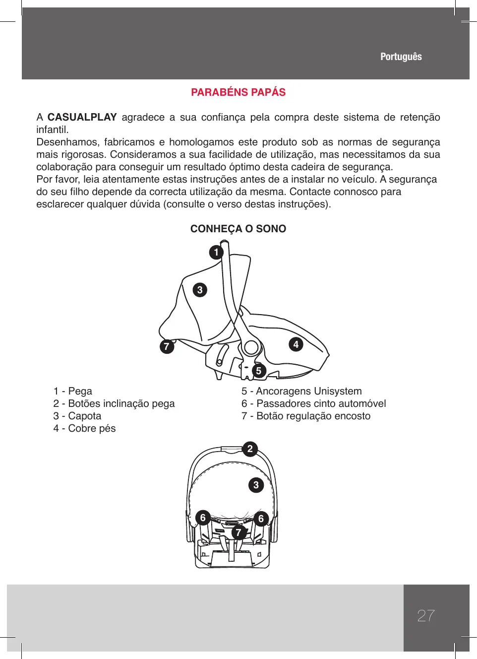 Português español PARABÉNS PAPÁS A CASUALPLAY agradece a sua confiança pela compra deste sistema de retenção infantil. Desenhamos, fabricamos e homologamos este produto sob as normas de segurança mais rigorosas. Consideramos a sua facilidade de utilização, mas necessitamos da sua colaboração para conseguir um resultado óptimo desta cadeira de segurança. Por favor, leia atentamente estas instruções antes de a instalar no veículo. A segurança do seu filho depende da correcta utilização da mesma. Contacte connosco para esclarecer qualquer dúvida (consulte o verso destas instruções). CONHEÇA O SONO 1 3