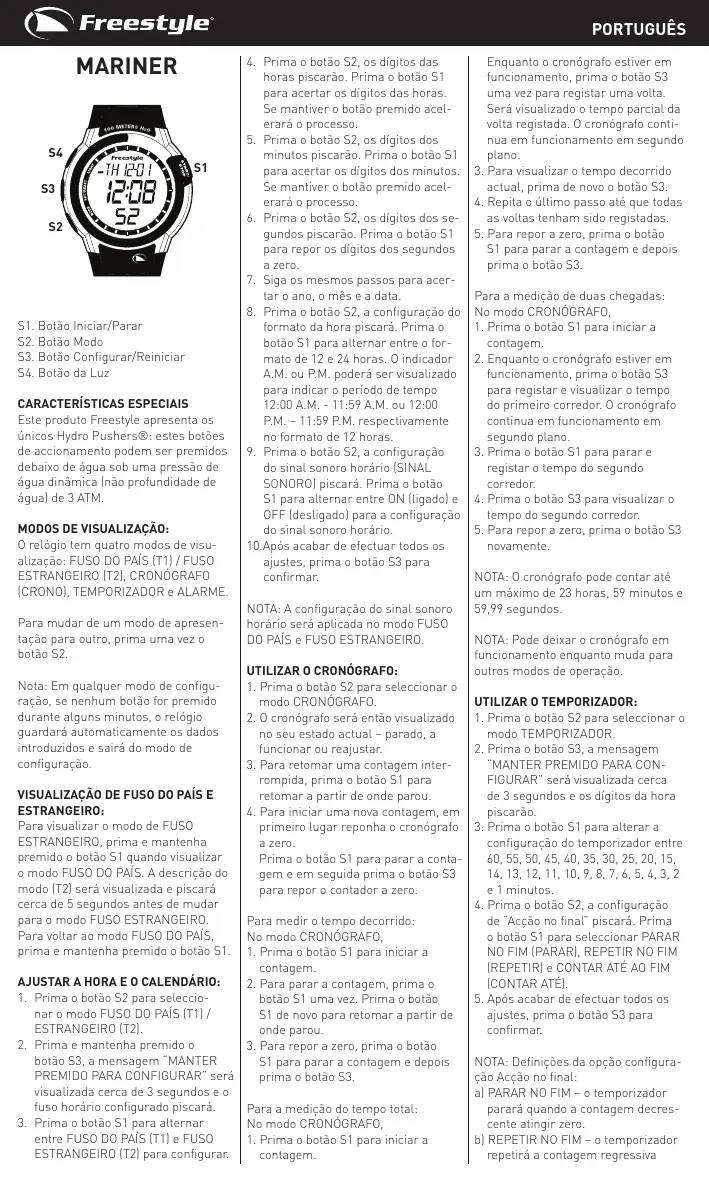 Este produto Freestyle apresenta os únicos Hydro Pushers®: estes botões de accionamento podem ser premidos debaixo de água sob uma pressão de água dinâmica (não profundidade de água) de 3 ATM. MODOS DE VISUALIZAÇÃO: O relógio tem quatro modos de visualização: FUSO DO PAÍS (T1) / FUSO