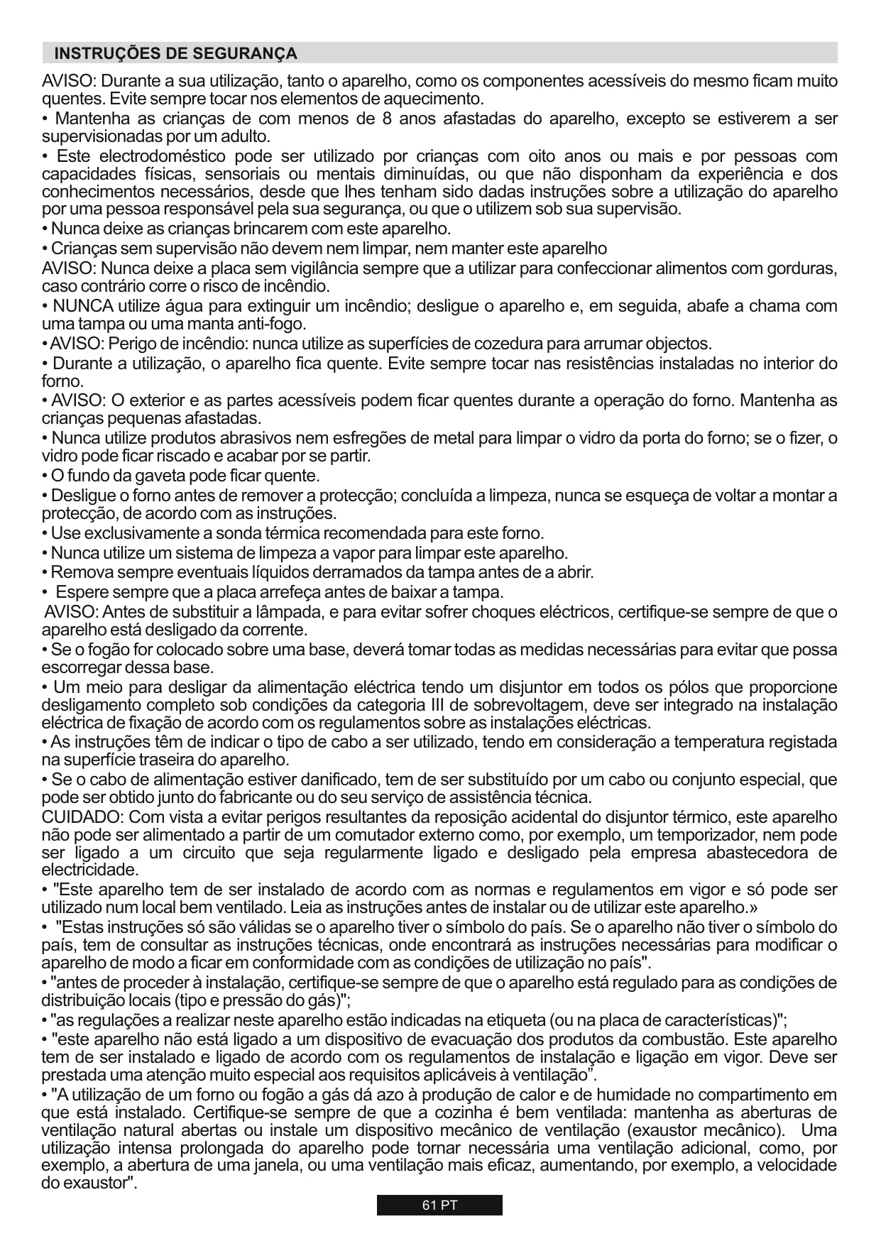 - O fogão só deve ser usado para a finalidade com que foi concebido: só deve ser utilizado para cozinhar alimentos. Qualquer outra utilização como, por exemplo, meio de aquecimento, é imprópria e deste modo perigosa.