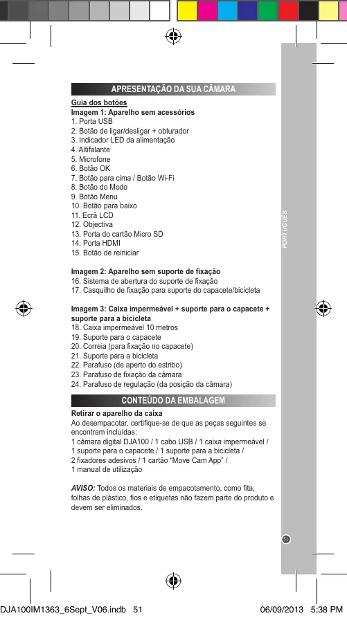 Retirar o aparelho da caixa Ao desempacotar, certifique-se de que as peças seguintes se encontram incluídas: 1 câmara digital DJA100 / 1 cabo USB / 1 caixa impermeável / 1 suporte para o capacete / 1 suporte para a bicicleta / 2 fixadores adesivos / 1 cartão “Move Cam App” / 1 manual de utilização AVISO: Todos os materiais de empacotamento, como fita, folhas de plástico, fios e etiquetas não fazem parte do produto e devem ser eliminados. DJA100IM1363_6Sept_V06.indb 51