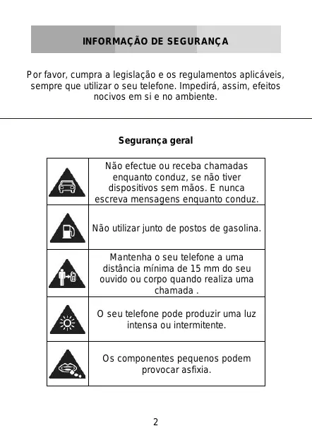 Ne pas utiliser le téléphone dans les stations services. Maintenez votre téléphone à au moins 15mm de votre oreille ou de votre corps lorsque vous téléphonez. Votre téléphone peut émettre une lumière intense ou un flash. De petits composants peuvent entraîner des étouffements.