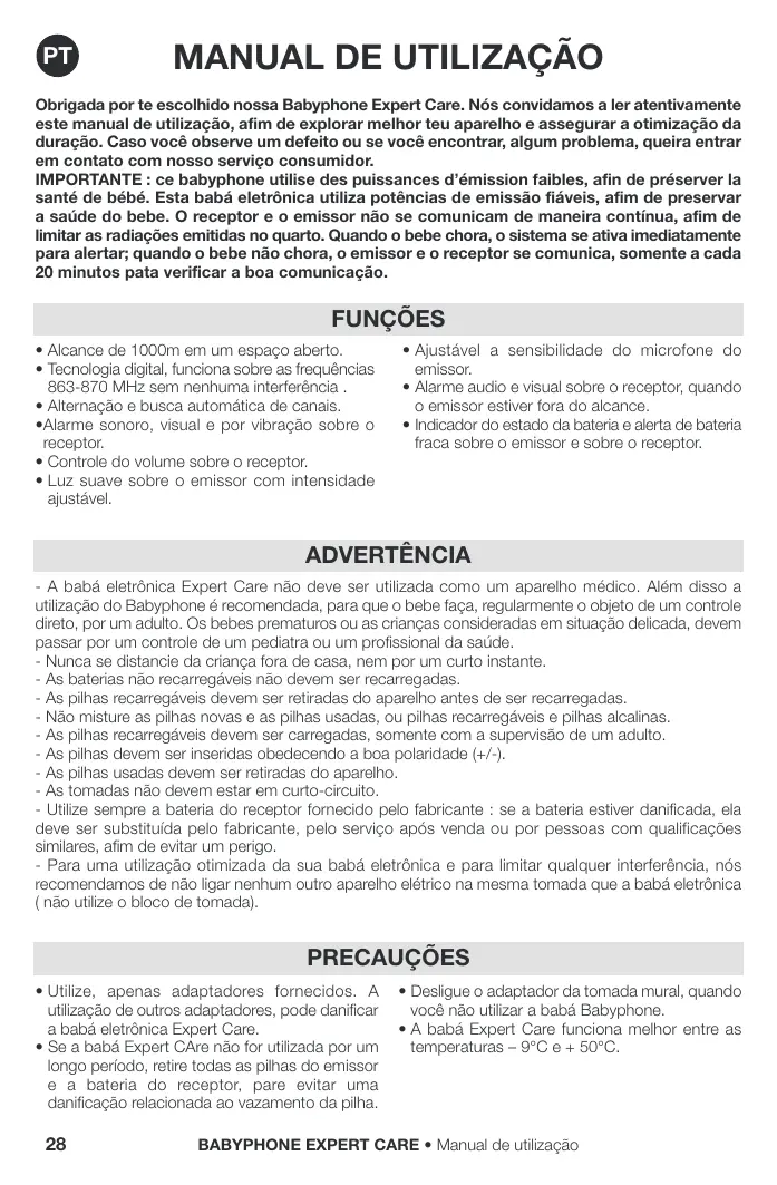 PT MANUAL DE UTILIZAÇÃO Obrigada por te escolhido nossa Babyphone Expert Care. Nós convidamos a ler atentivamente este manual de utilização, afim de explorar melhor teu aparelho e assegurar a otimização da duração. Caso você observe um defeito ou se você encontrar, algum problema, queira entrar em contato com nosso serviço consumidor. IMPORTANTE : ce babyphone utilise des puissances d’émission faibles, afin de préserver la santé de bébé. Esta babá eletrônica utiliza potências de emissão fiáveis, afim de preservar a saúde do bebe. O receptor e o emissor não se comunicam de maneira contínua, afim de limitar as radiações emitidas no quarto. Quando o bebe chora, o sistema se ativa imediatamente para alertar; quando o bebe não chora, o emissor e o receptor se comunica, somente a cada 20 minutos pata verificar a boa comunicação.