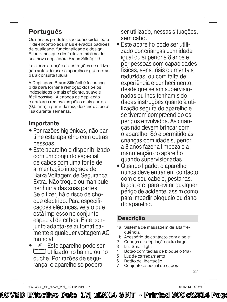 ser utilizado, nessas situações, sem cabo. • Este aparelho pode ser utilizado por crianças com idade igual ou superior a 8 anos e por pessoas com capacidades físicas, sensoriais ou mentais reduzidas, ou com falta de experiência e conhecimento, desde que sejam supervisionadas ou lhes tenham sido dadas instruções quanto à utilização segura do aparelho e se tiverem compreendido os perigos envolvidos. As crianças não devem brincar com o aparelho. Só é permitido às crianças com idade superior a 8 anos fazer a limpeza e a manutenção do aparelho quando supervisionadas. • Quando ligado, o aparelho nunca deve entrar em contacto com o seu cabelo, pestanas, laços, etc. para evitar qualquer perigo de acidente, assim como para impedir bloqueio ou dano do aparelho. Descrição 1a Sistema de massagem de alta frequência 1b Acessório de contacto com a pele 2 Cabeça de depilação extra larga 3 Luz Smartlight 4 Botão com teclas de bloqueio (4a) 5 Luz de carregamento 6 Botão de libertação 7 Conjunto especial de cabos 27