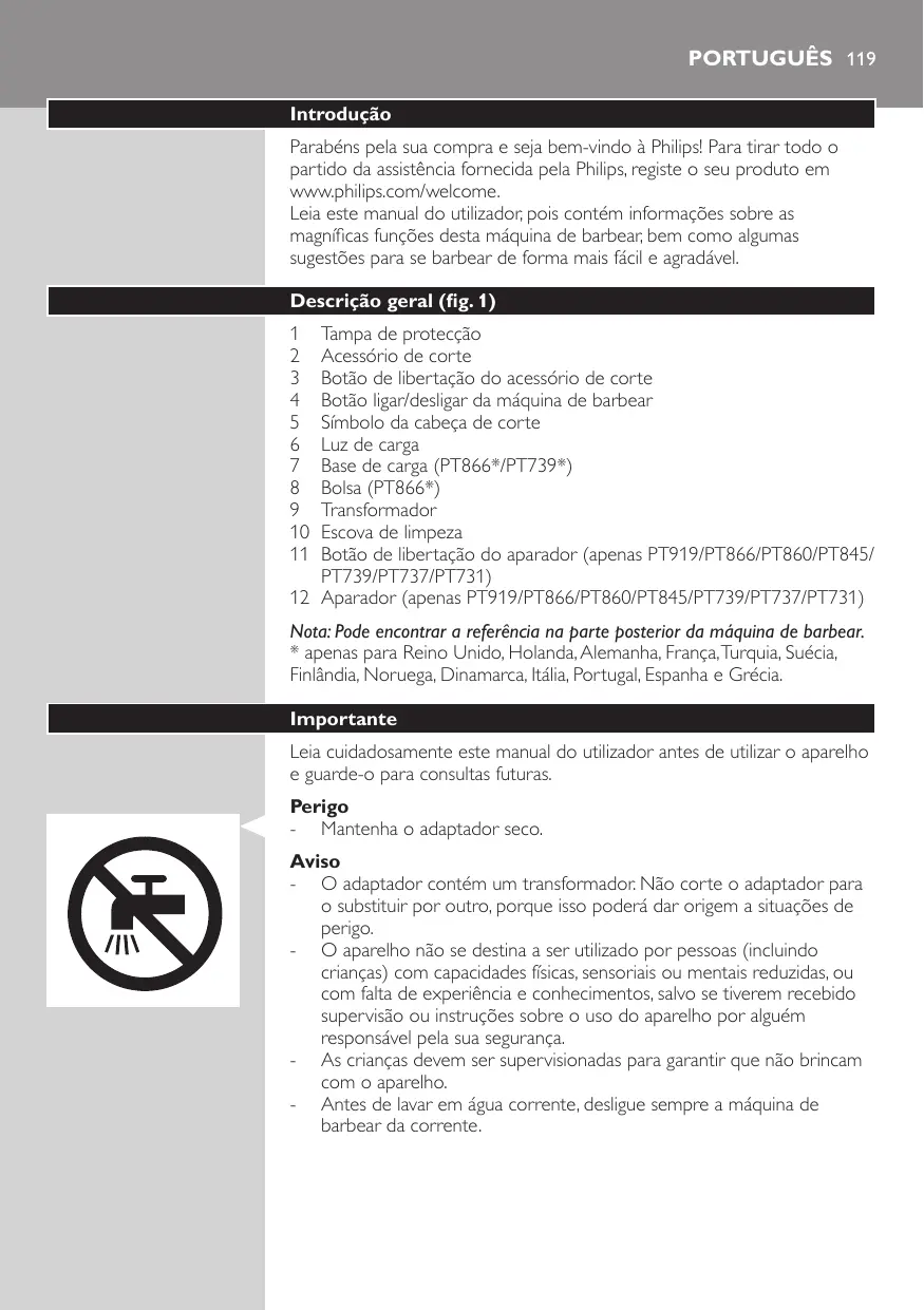 - apenas para Reino Unido, Holanda, Alemanha, França, Turquia, Suécia, Finlândia, Noruega, Dinamarca, Itália, Portugal, Espanha e Grécia. Importante Leia cuidadosamente este manual do utilizador antes de utilizar o aparelho e guarde-o para consultas futuras. Perigo -- Mantenha o adaptador seco. Aviso -- O adaptador contém um transformador. Não corte o adaptador para o substituir por outro, porque isso poderá dar origem a situações de perigo. -- O aparelho não se destina a ser utilizado por pessoas (incluindo crianças) com capacidades físicas, sensoriais ou mentais reduzidas, ou com falta de experiência e conhecimentos, salvo se tiverem recebido supervisão ou instruções sobre o uso do aparelho por alguém responsável pela sua segurança. -- As crianças devem ser supervisionadas para garantir que não brincam com o aparelho. -- Antes de lavar em água corrente, desligue sempre a máquina de barbear da corrente.