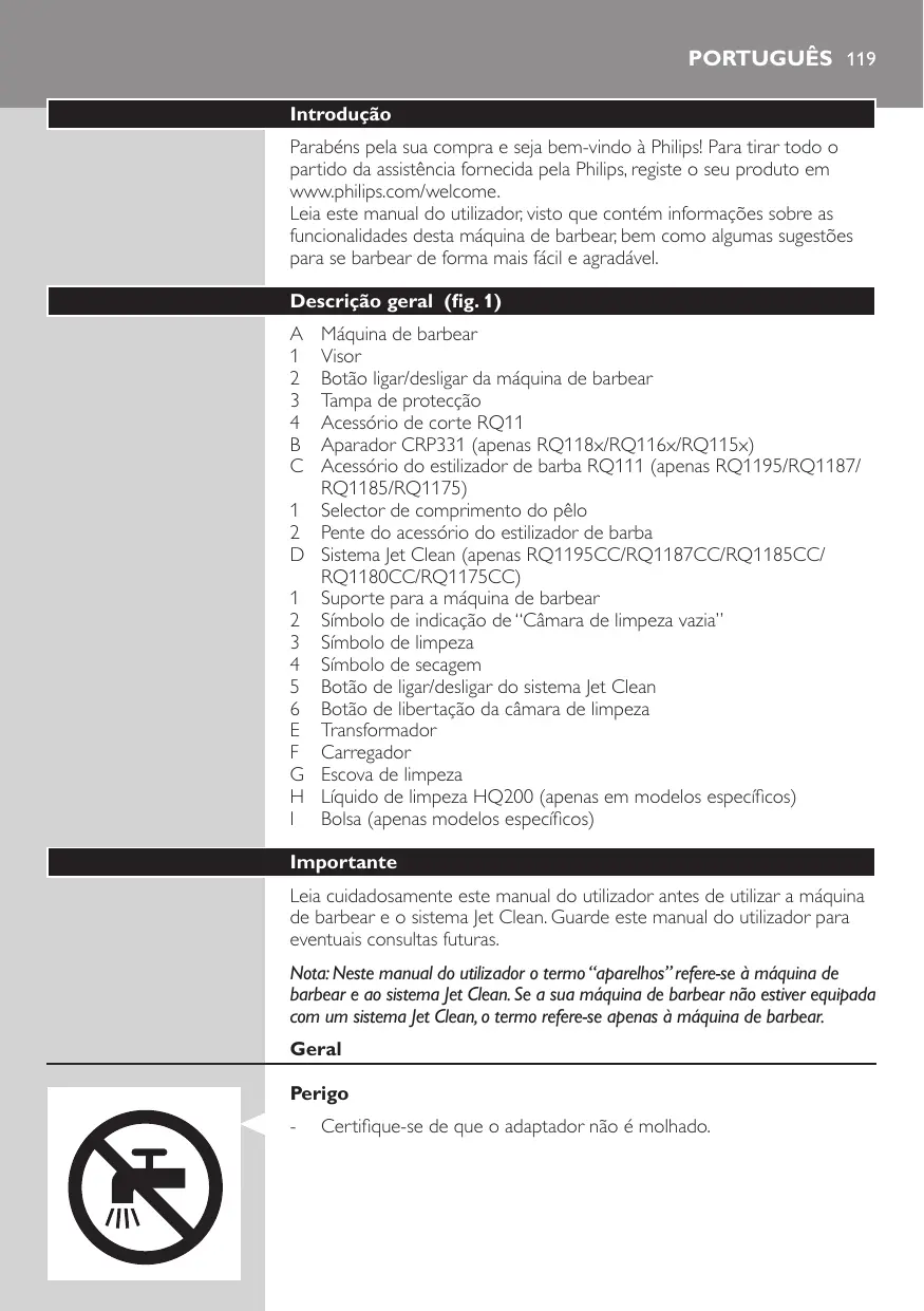 6 Botão de libertação da câmara de limpeza E Transformador F Carregador G Escova de limpeza H Líquido de limpeza HQ200 (apenas em modelos específicos) 5 Botón de encendido/apagado del sistema Jet Clean 6 Botón de liberación de la cámara de limpieza E Adaptador de corriente F Cargador G Cepillo de limpieza H Líquido limpiador HQ200 (solo en modelos específicos) I Funda (sólo en modelos específicos) Importante Antes de usar la afeitadora y el sistema Jet Clean, lea atentamente este manual de usuario y consérvelo por si necesitara consultarlo en el futuro. Nota: En este manual de usuario, el término “aparatos” se refiere a la afeitadora y al sistema Jet Clean. Si la afeitadora no dispone de sistema Jet Clean, se referirá únicamente a la afeitadora. General Peligro -- Asegúrese de que el adaptador no se moje.