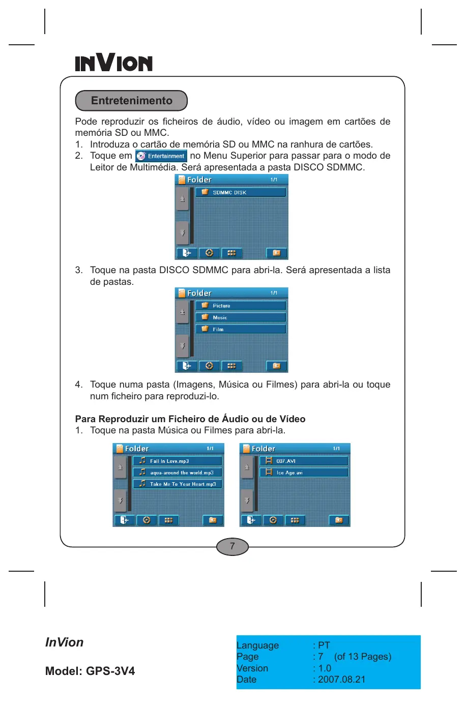 InVion Model: GPS-3V4 Language Page Version Date : PT : (of 13 Pages) : 1.0 : 2007.08.21 Entretenimento Pode reproduzir os ficheiros de áudio, vídeo ou imagem em cartões de memória SD ou MMC. . Introduza o cartão de memória SD ou MMC na ranhura de cartões.