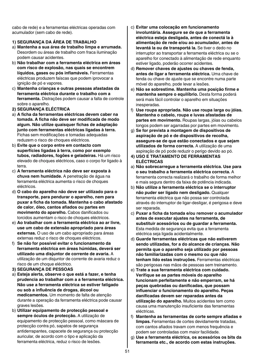 2) SECURITE RELATIVE AU SYSTEME ELECTRIQUE a) La fiche de secteur de l’outil électroportatif doit être appropriée à la prise de courant. Ne modifiez en aucun cas la fiche. N’utilisez pas de fiches d’adaptateur avec des appareils avec mise à la terre. Les fiches non modifiées et les prises de courant appropriées réduisent le risque de choc électrique. b) Evitez le contact physique avec des surfaces mises à la terre telles que tuyaux, radiateurs, fours et réfrigérateurs. Il y a un risque élevé de choc électrique au cas où votre corps serait relié à la terre. c) N’exposez pas l’outil électroportatif à la pluie ou à l’humidité. La pénétration d’eau dans un outil électroportatif augmente le risque d’un choc électrique. d) N’utilisez pas le câble à d’autres fins que celles prévues, n’utilisez pas le câble pour porter l’appareil ou pour l’accrocher ou encore pour le débrancher de la prise de courant. Maintenez le câble éloigné des sources de chaleur, des parties grasses, des bords tranchants ou des parties de l’appareil en rotation. Un câble endommagé ou torsadé augmente le risque d’un choc électrique. e) Au cas où vous utiliseriez l’outil électroportatif à l’extérieur, utilisez une rallonge autorisée homologuée pour les applications extérieures. L’utilisation d’une rallonge électrique homologuée pour les applications extérieures réduit le risque d’un choc électrique. f) Si l’usage d’un outil dans un emplacement humide est inévitable, utilisez un disjoncteur de fuite à la terre. L’utilisation d’un disjoncteur de fuite à la terre réduit le risque de choc électrique. 3) SECURITE DES PERSONNES a) Restez vigilant, surveillez ce que vous faites. Faites preuve de bon sens en utilisant l’outil électroportatif. N’utilisez pas l’appareil lorsque vous êtes fatigué ou après avoir consommé de l’alcool, des drogues ou avoir pris des médicaments. Un moment d’inattention lors de l’utilisation de l’appareil peut entraîner de graves blessures sur les personnes.