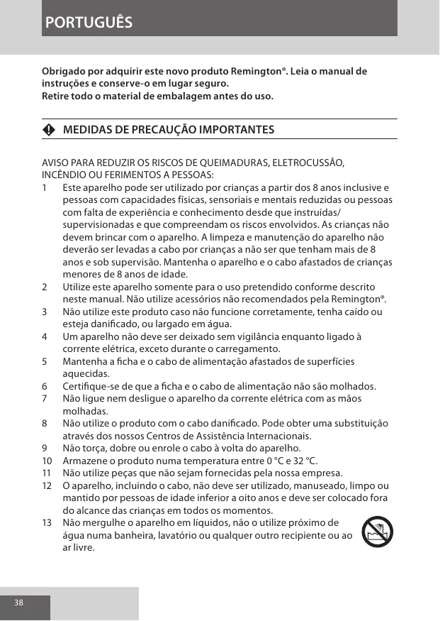 AVISO PARA REDUZIR OS RISCOS DE QUEIMADURAS, ELETROCUSSÃO, INCÊNDIO OU FERIMENTOS A PESSOAS: Este aparelho pode ser utilizado por crianças a partir dos 8 anos inclusive e pessoas com capacidades físicas, sensoriais e mentais reduzidas ou pessoas com falta de experiência e conhecimento desde que instruídas/ supervisionadas e que compreendam os riscos envolvidos. As crianças não devem brincar com o aparelho. A limpeza e manutenção do aparelho não deverão ser levadas a cabo por crianças a não ser que tenham mais de 8 anos e sob supervisão. Mantenha o aparelho e o cabo afastados de crianças menores de 8 anos de idade. Utilize este aparelho somente para o uso pretendido conforme descrito neste manual. Não utilize acessórios não recomendados pela Remington®. Não utilize este produto caso não funcione corretamente, tenha caído ou esteja danificado, ou largado em água. Um aparelho não deve ser deixado sem vigilância enquanto ligado à corrente elétrica, exceto durante o carregamento. Mantenha a ficha e o cabo de alimentação afastados de superfícies aquecidas. Certifique-se de que a ficha e o cabo de alimentação não são molhados. Não ligue nem desligue o aparelho da corrente elétrica com as mãos molhadas. Não utilize o produto com o cabo danificado. Pode obter uma substituição através dos nossos Centros de Assistência Internacionais. Não torça, dobre ou enrole o cabo à volta do aparelho. 10 Armazene o produto numa temperatura entre 0 °C e 32 °C. 11 Não utilize peças que não sejam fornecidas pela nossa empresa. 12 O aparelho, incluindo o cabo, não deve ser utilizado, manuseado, limpo ou mantido por pessoas de idade inferior a oito anos e deve ser colocado fora do alcance das crianças em todos os momentos. 13 Não mergulhe o aparelho em líquidos, não o utilize próximo de água numa banheira, lavatório ou qualquer outro recipiente ou ao ar livre.