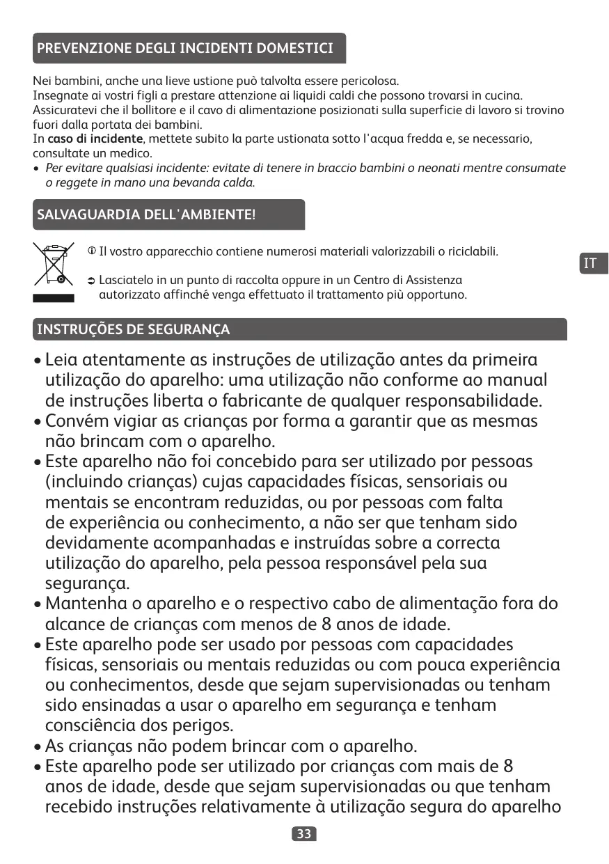 • La bouilloire ne fonctionne pas, ou s’arrête avant ébullition –– Vérifiez que votre bouilloire a bien été branchée. –– La bouilloire a fonctionné sans eau, ou du tartre s’est accumulé, provoquant le déclenchement du système de sécurité contre le fonctionnement à sec : laissez refroidir la bouilloire, remplissez d’eau. Mettez en marche à l’aide de l’interrupteur : la bouilloire recommence à fonctionner après environ 15 minutes. • L’eau a un goût de plastique : Généralement, ceci se produit lorsque la bouilloire est neuve, jetez l’eau des premières utilisations. Si le problème persiste, remplissez la bouilloire au maximum, ajoutez deux cuillères à café de bicarbonate de soude. Faites bouillir et jetez l’eau. Rincez la bouilloire. SI VOTRE BOUILLOIRE EST TOMBÉE, SI ELLE PRÉSENTE DES FUITES, SI LE CORDON, LA PRISE OU LE SOCLE DE LA BOUILLOIRE SONT ENDOMMAGÉS DE FAÇON VISIBLE Retournez votre bouilloire à votre Centre de Service Après-Vente , seul habilité à effectuer une réparation. Voir conditions de garantie et liste des centres sur le livret fourni avec votre bouilloire. Le type et le numéro de série sont indiqués sur le fond de votre modèle. Cette garantie couvre les défauts de fabrication et l’usage domestique uniquement. Toute casse ou détérioration résultant du non respect des instructions d’utilisation n’entre pas dans le cadre de la garantie. • Le fabricant se réserve le droit de modifier à tout moment, dans l’intérêt du consommateur, les caractéristiques ou composants de ses bouilloires. • N’utilisez pas la bouilloire. Aucune tentative ne doit être faite pour démonter l’appareil ou les dispositifs de sécurité. • Si le câble d’alimentation est endommagé, il doit être remplacé par le fabricant, son service après-vente ou une personne de qualification similaire afin d’éviter un danger.