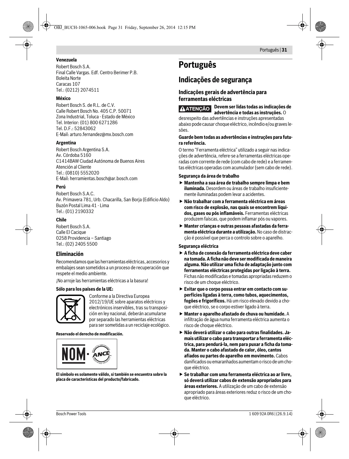 Declaração de conformidade Declaramos sob nossa inteira responsabilidade que o produto descrito nos “Dados técnicos” está em conformidade com todas as disposições pertinentes das Directivas 2011/65/UE, 2014/30/UE, 2006/42/CE incluindo suas alterações, e em conformidade com as seguintes normas: EN 60745-1, EN 60745-2-11. Processo técnico (2006/42/CE) em: Robert Bosch GmbH, PT/ETM9, 70764 Leinfelden-Echterdingen, GERMANY Henk Becker Helmut Heinzelmann Executive Vice President Head of Product Certification Engineering PT/ETM9