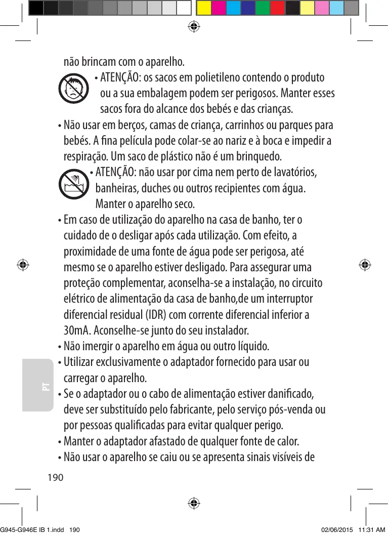 • Ne pas les utiliser dans les berceaux, les lits d’enfants, les poussettes ou les parcs pour bébés. Le fin film peut coller au nez et à la bouche et empêcher la respiration. Un sachet n’est pas un jouet. • ATTENTION: ne pas utiliser au-dessus ou à proximité de lavabos, baignoires, douches ou autres récipients contenant de l’eau. Maintenir l’appareil au sec. • En cas d’utilisation de l’appareil dans une salle de bain, veillez à le débrancher après vous en être servi. En effet, la proximité d’une source d’eau peut être dangereuse même si l’appareil est éteint. Pour assurer une protection complémentaire, l’installation, dans le circuit électrique alimentant la salle de bain, d’un dispositif à courant différentiel résiduel (DDR) de courant différentiel de fonctionnement assigné n’excédant pas 30mA, est conseillée. Demandez conseil à votre installateur. • Ne plongez pas l’appareil dans l’eau ou dans tout autre liquide. • Utiliser exclusivement l’adaptateur fourni pour utiliser ou charger l’appareil. • Si l’adaptateur ou le cordon d’alimentation est endommagé, il doit être remplacé par le fabricant, son service après vente ou des personnes de qualification similaire afin d’éviter un danger. 5