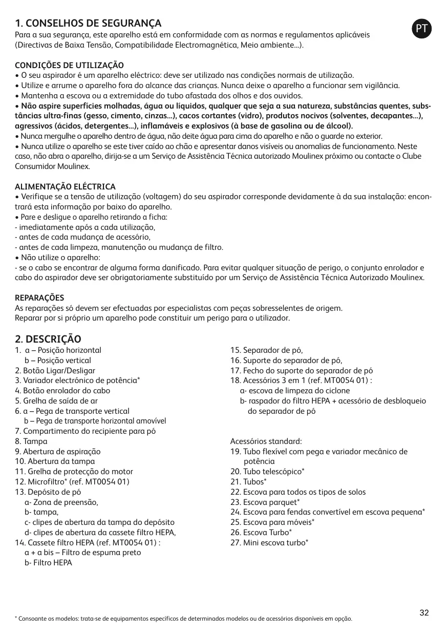 1. a – Parking horizontal b – Parking vertical 19. Flexible avec crosse et variateur mécanique de puissance 20. Tube télescopique* 21. Tubes* • Ne le coincez pas et ne le passez pas sur des arêtes tranchantes. • Si vous utilisez une rallonge électrique, assurez-vous qu’elle est en parfait état et de section adaptée à la puissance de votre aspirateur. • Votre aspirateur est équipé d'une protection qui évite la surchauffe du moteur. Dans certains cas (utilisation de la crosse sur fauteuil, sièges…) la protection se déclenche et l'appareil peut émettre un bruit inhabituel et sans gravité. • Ne déplacez pas l’aspirateur en tirant sur le cordon, l’appareil doit être déplacé par sa poignée de transport. • N’utilisez pas le cordon pour soulever l’appareil. • Ne débranchez jamais l’appareil en tirant sur le cordon. • Ne faites jamais fonctionner l’aspirateur sans boîte à poussière (13) ni sans cassette filtre HEPA (14) : filtre mousse noir (14a) et fitre HEPA (14b). • N’utilisez que des filtres d’origine Moulinex. • N’utilisez que des accessoires d’origine Moulinex. • En cas de difficultés pour obtenir les accessoires et les filtres pour cet aspirateur, contactez le service consommateurs Moulinex. • Arrêtez et débranchez votre aspirateur après chaque utilisation. • Arrêtez et débranchez toujours votre aspirateur avant l’entretien ou le nettoyage. • Cet appareil n’est pas prévu pour être utilisé par des personnes (y compris les enfants) dont les capacités physiques, sensorielles ou mentales sont réduites, ou des personnes dénuées d’expérience ou de connaissance, sauf si elles ont pu bénéficier, par l’intermédiaire d’une personne responsable de leur sécurité, d’une surveillance ou d’instructions préalables concernant l’utilisation de l’appareil. Il convient de surveiller les enfants pour s’assurer qu’ils ne jouent pas avec l’appareil.