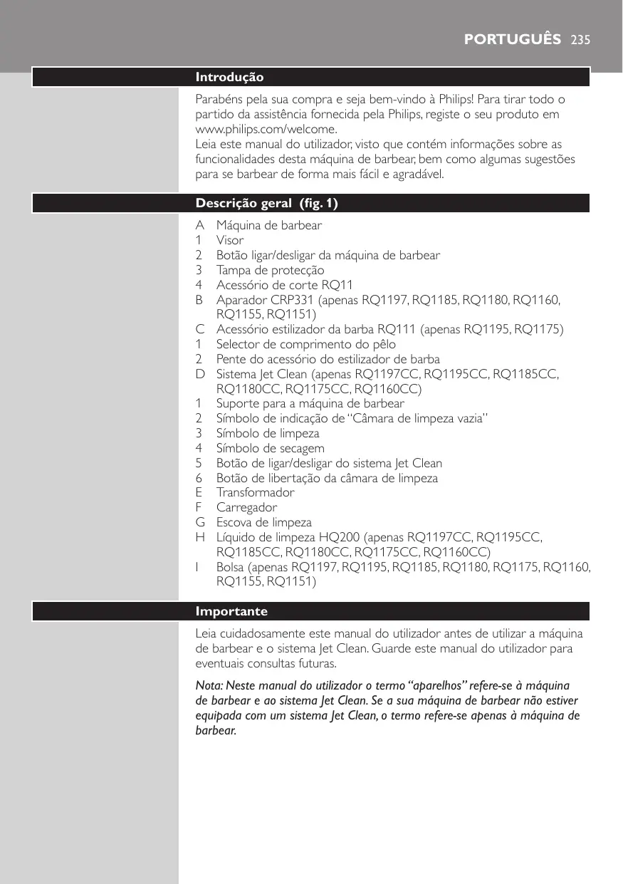 E F G H I Máquina de barbear Visor Botão ligar/desligar da máquina de barbear Tampa de protecção Acessório de corte RQ11 Aparador CRP331 (apenas RQ1197, RQ1185, RQ1180, RQ1160, RQ1155, RQ1151) Acessório estilizador da barba RQ111 (apenas RQ1195, RQ1175) Selector de comprimento do pêlo Pente do acessório do estilizador de barba Sistema Jet Clean (apenas RQ1197CC, RQ1195CC, RQ1185CC, RQ1180CC, RQ1175CC, RQ1160CC) Suporte para a máquina de barbear Símbolo de indicação de “Câmara de limpeza vazia” Símbolo de limpeza Símbolo de secagem Botão de ligar/desligar do sistema Jet Clean Botão de libertação da câmara de limpeza Transformador Carregador Escova de limpeza Líquido de limpeza HQ200 (apenas RQ1197CC, RQ1195CC, RQ1185CC, RQ1180CC, RQ1175CC, RQ1160CC) Bolsa (apenas RQ1197, RQ1195, RQ1185, RQ1180, RQ1175, RQ1160, RQ1155, RQ1151)