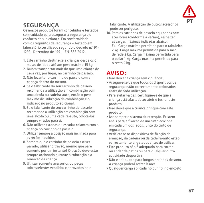 (1) I prodotti acquistati presso rivenditori che rimuovono o modificano le etichette o i numeri di identificazione sono considerati non autorizzati. Prodotti acquistati presso rivenditori non autorizzati sono considerati essi stessi non autorizzati. Nessuna garanzia si applica a questi prodotti, in quanto l’autenticità di questi prodotti non può essere accertata. SEGURANÇA Os nossos produtos foram concebidos e testados com cuidado para assegurar a segurança e o conforto da sua criança. Em conformidade com os requisitos de segurança – Testado em laboratório certificado segundo o decreto n.° 911292 - Dezembro de 1991 - EN1888:2012.
