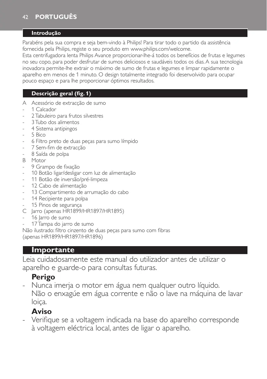 PORTUGUÊS Introdução Parabéns pela sua compra e seja bem-vindo à Philips! Para tirar todo o partido da assistência fornecida pela Philips, registe o seu produto em www.philips.com/welcome. Esta centrifugadora lenta Philips Avance proporcionar-lhe-á todos os benefícios de frutas e legumes no seu copo, para poder desfrutar de sumos deliciosos e saudáveis todos os dias. A sua tecnologia inovadora permite-lhe extrair o máximo de sumo de frutas e legumes e limpar rapidamente o aparelho em menos de 1 minuto. O design totalmente integrado foi desenvolvido para ocupar pouco espaço e para lhe proporcionar óptimos resultados. Descrição geral (fig. 1) A Acessório de extracção de sumo -- 1 Calcador -- 2 Tabuleiro para frutos silvestres -- 3 Tubo dos alimentos -- 4 Sistema antipingos -- 5 Bico -- 6 Filtro preto de duas peças para sumo límpido -- 7 Sem-fim de extracção -- 8 Saída de polpa B Motor -- 9 Grampo de fixação -- 10 Botão ligar/desligar com luz de alimentação -- 11 Botão de inversão/pré-limpeza -- 12 Cabo de alimentação -- 13 Compartimento de arrumação do cabo -- 14 Recipiente para polpa -- 15 Pinos de segurança C Jarro (apenas HR1899/HR1897/HR1895) -- 16 Jarro de sumo -- 17 Tampa do jarro de sumo Não ilustrado: filtro cinzento de duas peças para sumo com fibras (apenas HR1899/HR1897/HR1896) Importante Leia cuidadosamente este manual do utilizador antes de utilizar o aparelho e guarde-o para consultas futuras. Perigo -- Nunca imerja o motor em água nem qualquer outro líquido. Não o enxagúe em água corrente e não o lave na máquina de lavar loiça. Aviso -- Verifique se a voltagem indicada na base do aparelho corresponde à voltagem eléctrica local, antes de ligar o aparelho. PORTUGUÊS 43 -- Não utilize o aparelho se a ficha, o cabo de alimentação ou outras peças estiverem danificados. Se o cabo de alimentação estiver danificado, deve ser sempre substituído pela Philips, por um centro de assistência autorizado da Philips ou por pessoal devidamente qualificado, para evitar situações de perigo. -- Este aparelho destina-se apenas a utilização doméstica. Se for utilizado incorrectamente ou para fins profissionais ou semiprofissionais, ou se for utilizado de uma forma que não esteja nas instruções de utilização no manual do utilizador, a garantia é considerada inválida e a Philips recusa qualquer responsabilidade pelos danos causados. -- Este aparelho pode ser utilizado por pessoas com capacidades físicas, sensoriais ou mentais reduzidas, ou com falta de experiência e conhecimento, caso sejam supervisionadas ou lhes tenham sido dadas instruções relativas à utilização segura do aparelho e se compreenderem os perigos envolvidos. -- Este aparelho não pode ser utilizado por crianças. Mantenha o aparelho e o seu cabo fora do alcance de crianças. -- As crianças não podem brincar com o aparelho. -- Nunca introduza os dedos nem objectos no tubo dos alimentos com o aparelho em funcionamento. Utilize apenas o calcador para esta finalidade. -- Desligue sempre o aparelho da alimentação se o deixar sem supervisão e antes de o montar, desmontar ou limpar. -- Desenrole sempre o cabo de alimentação completamente antes de ligar o aparelho. -- Nunca deixe o aparelho a funcionar sem vigilância. Cuidado -- Nunca utilize quaisquer acessórios ou peças de outros fabricantes ou que a Philips não tenha especificamente recomendado. Se utilizar tais acessórios ou peças, a garantia será considerada inválida. -- Coloque sempre o aparelho sobre uma superfície estável, plana e horizontal. -- Não utilize o aparelho no exterior. -- Evite o contacto com peças móveis. -- Certifique-se de que todas as peças estão correctamente montadas antes de ligar o aparelho. -- Utilize o aparelho apenas quando o grampo de fixação estiver na posição bloqueada.