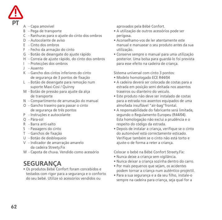 - Capa amovível - Pega de transporte - Ranhuras para o ajuste do cinto dos ombros - Autocolante de aviso - Cinto dos ombros - Fecho da armação do cinto - Botão de desengate do ajuste rápido - Correia de ajuste rápido, do cinto dos ombros - Protecções dos ombros - Assento - Gancho dos cintos inferiores do cinto de segurança de 3 pontos de fixação - Botão de desengate para remoção num suporte Maxi-Cosi / Quinny - Botão de pressão para ajuste da alça de transporte - Compartimento de arrumação do manual - Gancho traseiro para passar o cinto de segurança de três pontos - Instruções e autocolante - Pára-sol - Barra anti-salto - Passagens do cinto - Ganchos de fixação - Botão de desbloqueio - Indicador de amarração amarelo da cadeira Streety.Fix - Capota de chuva. Vendido como acessório SEGURANÇA