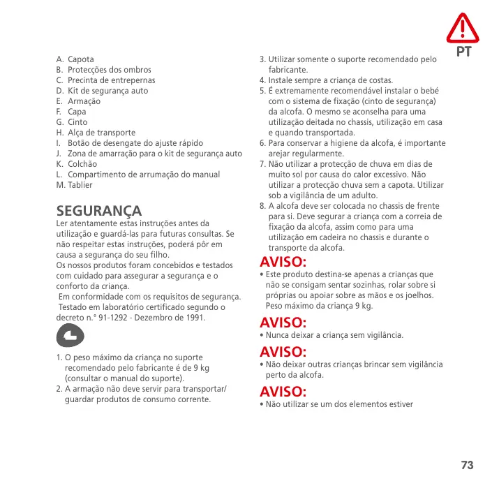 J. Zona de amarração para o kit de segurança auto K. Colchão L. Compartimento de arrumação do manual M. Tablier SEGURANÇA Ler atentamente estas instruções antes da utilização e guardá-las para futuras consultas. Se não respeitar estas instruções, poderá pôr em causa a segurança do seu filho. Os nossos produtos foram concebidos e testados com cuidado para assegurar a segurança e o conforto da criança. Em conformidade com os requisitos de segurança. Testado em laboratório certificado segundo o decreto n.° 91-1292 - Dezembro de 1991.