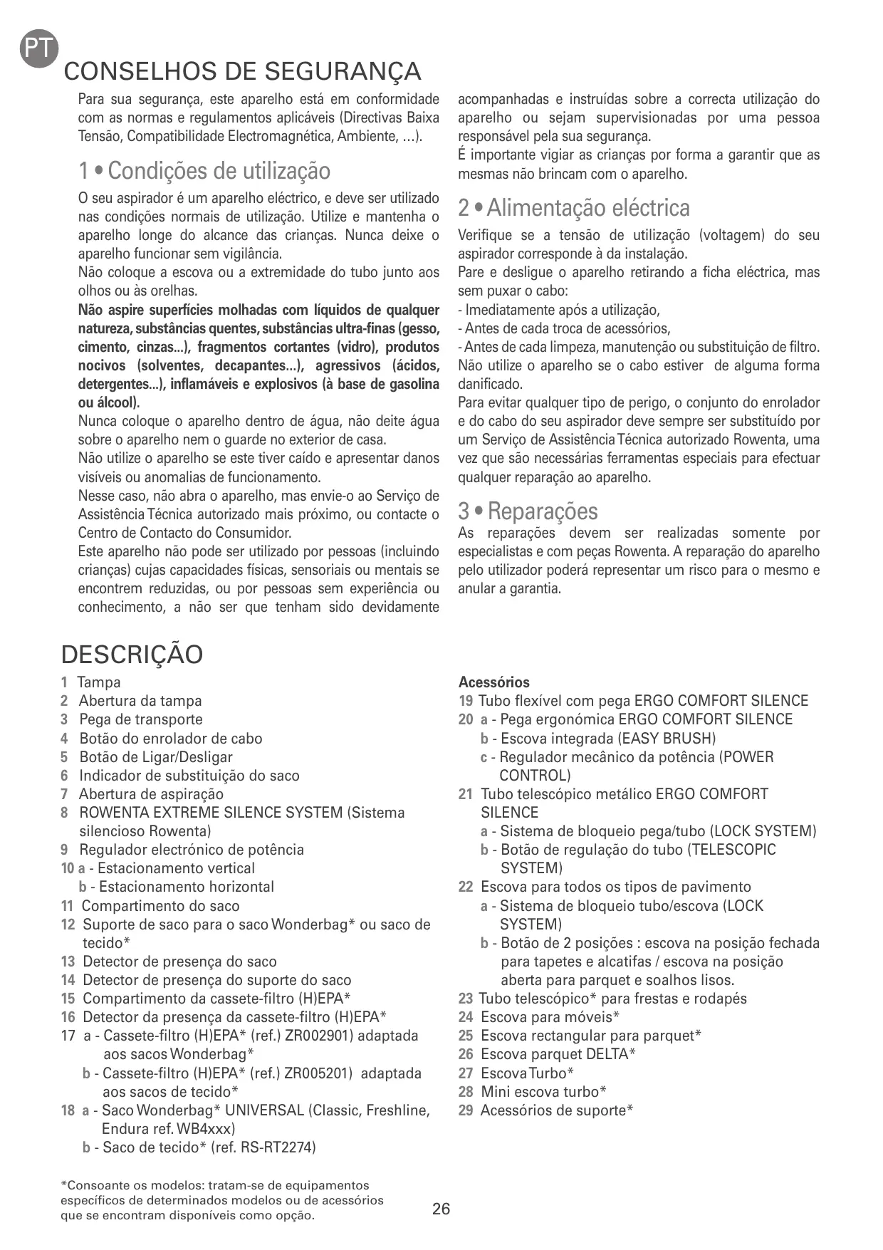 Para sua segurança, este aparelho está em conformidade com as normas e regulamentos aplicáveis (Directivas Baixa Tensão, Compatibilidade Electromagnética, Ambiente, …). 1 • Condições de utilização O seu aspirador é um aparelho eléctrico, e deve ser utilizado nas condições normais de utilização. Utilize e mantenha o aparelho longe do alcance das crianças. Nunca deixe o aparelho funcionar sem vigilância. Não coloque a escova ou a extremidade do tubo junto aos olhos ou às orelhas. Não aspire superfícies molhadas com líquidos de qualquer natureza, substâncias quentes, substâncias ultra-finas (gesso, cimento, cinzas...), fragmentos cortantes (vidro), produtos nocivos (solventes, decapantes...), agressivos (ácidos, detergentes...), inflamáveis e explosivos (à base de gasolina ou álcool). Nunca coloque o aparelho dentro de água, não deite água sobre o aparelho nem o guarde no exterior de casa. Não utilize o aparelho se este tiver caído e apresentar danos visíveis ou anomalias de funcionamento. Nesse caso, não abra o aparelho, mas envie-o ao Serviço de Assistência Técnica autorizado mais próximo, ou contacte o Centro de Contacto do Consumidor. Este aparelho não pode ser utilizado por pessoas (incluindo crianças) cujas capacidades físicas, sensoriais ou mentais se encontrem reduzidas, ou por pessoas sem experiência ou conhecimento, a não ser que tenham sido devidamente acompanhadas e instruídas sobre a correcta utilização do aparelho ou sejam supervisionadas por uma pessoa responsável pela sua segurança. É importante vigiar as crianças por forma a garantir que as mesmas não brincam com o aparelho. 2 • Alimentação eléctrica Verifique se a tensão de utilização (voltagem) do seu aspirador corresponde à da instalação. Pare e desligue o aparelho retirando a ficha eléctrica, mas sem puxar o cabo: - Imediatamente após a utilização, - Antes de cada troca de acessórios, - Antes de cada limpeza, manutenção ou substituição de filtro. Não utilize o aparelho se o cabo estiver de alguma forma danificado. Para evitar qualquer tipo de perigo, o conjunto do enrolador e do cabo do seu aspirador deve sempre ser substituído por um Serviço de Assistência Técnica autorizado Rowenta, uma vez que são necessárias ferramentas especiais para efectuar qualquer reparação ao aparelho. 3 • Reparações As reparações devem ser realizadas somente por especialistas e com peças Rowenta. A reparação do aparelho pelo utilizador poderá representar um risco para o mesmo e anular a garantia. DESCRIÇÃO Tampa Abertura da tampa Pega de transporte Botão do enrolador de cabo Botão de Ligar/Desligar Indicador de substituição do saco Abertura de aspiração ROWENTA EXTREME SILENCE SYSTEM (Sistema silencioso Rowenta) 9 Regulador electrónico de potência 10 a - Estacionamento vertical b - Estacionamento horizontal 11 Compartimento do saco 12 Suporte de saco para o saco Wonderbag* ou saco de tecido* 13 Detector de presença do saco 14 Detector de presença do suporte do saco 15 Compartimento da cassete-filtro (H)EPA* 16 Detector da presença da cassete-filtro (H)EPA* 17 a - Cassete-filtro (H)EPA* (ref.) ZR002901) adaptada aos sacos Wonderbag* b - Cassete-filtro (H)EPA* (ref.) ZR005201) adaptada aos sacos de tecido* 18 a - Saco Wonderbag* UNIVERSAL (Classic, Freshline, Endura ref. WB4xxx) b - Saco de tecido* (ref. RS-RT2274) Acessórios 19 Tubo flexível com pega ERGO COMFORT SILENCE 20 a - Pega ergonómica ERGO COMFORT SILENCE b - Escova integrada (EASY BRUSH) c - Regulador mecânico da potência (POWER CONTROL) 21 Tubo telescópico metálico ERGO COMFORT SILENCE a - Sistema de bloqueio pega/tubo (LOCK SYSTEM) b - Botão de regulação do tubo (TELESCOPIC SYSTEM) 22 Escova para todos os tipos de pavimento a - Sistema de bloqueio tubo/escova (LOCK SYSTEM) b - Botão de 2 posições : escova na posição fechada para tapetes e alcatifas / escova na posição aberta para parquet e soalhos lisos. 23 Tubo telescópico* para frestas e rodapés 24 Escova para móveis* 25 Escova rectangular para parquet* 26 Escova parquet DELTA* 27 Escova Turbo* 28 Mini escova turbo* 29 Acessórios de suporte*