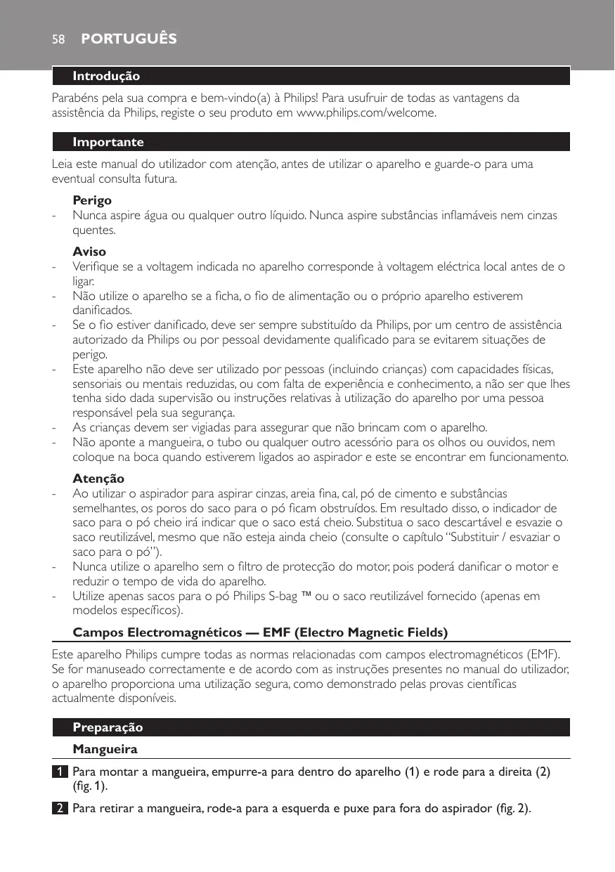 Parabéns pela sua compra e bem-vindo(a) à Philips! Para usufruir de todas as vantagens da assistência da Philips, registe o seu produto em www.philips.com/welcome. Importante Leia este manual do utilizador com atenção, antes de utilizar o aparelho e guarde-o para uma eventual consulta futura. Perigo -- Nunca aspire água ou qualquer outro líquido. Nunca aspire substâncias inflamáveis nem cinzas quentes. Aviso -- Verifique se a voltagem indicada no aparelho corresponde à voltagem eléctrica local antes de o ligar. -- Não utilize o aparelho se a ficha, o fio de alimentação ou o próprio aparelho estiverem danificados. -- Se o fio estiver danificado, deve ser sempre substituído da Philips, por um centro de assistência autorizado da Philips ou por pessoal devidamente qualificado para se evitarem situações de perigo. -- Este aparelho não deve ser utilizado por pessoas (incluindo crianças) com capacidades físicas, sensoriais ou mentais reduzidas, ou com falta de experiência e conhecimento, a não ser que lhes tenha sido dada supervisão ou instruções relativas à utilização do aparelho por uma pessoa responsável pela sua segurança. -- As crianças devem ser vigiadas para assegurar que não brincam com o aparelho. -- Não aponte a mangueira, o tubo ou qualquer outro acessório para os olhos ou ouvidos, nem coloque na boca quando estiverem ligados ao aspirador e este se encontrar em funcionamento. Atenção -- Ao utilizar o aspirador para aspirar cinzas, areia fina, cal, pó de cimento e substâncias semelhantes, os poros do saco para o pó ficam obstruídos. Em resultado disso, o indicador de saco para o pó cheio irá indicar que o saco está cheio. Substitua o saco descartável e esvazie o saco reutilizável, mesmo que não esteja ainda cheio (consulte o capítulo “Substituir / esvaziar o saco para o pó”). -- Nunca utilize o aparelho sem o filtro de protecção do motor, pois poderá danificar o motor e reduzir o tempo de vida do aparelho. -- Utilize apenas sacos para o pó Philips S-bag ` ou o saco reutilizável fornecido (apenas em modelos específicos). Campos Electromagnéticos — EMF (Electro Magnetic Fields)