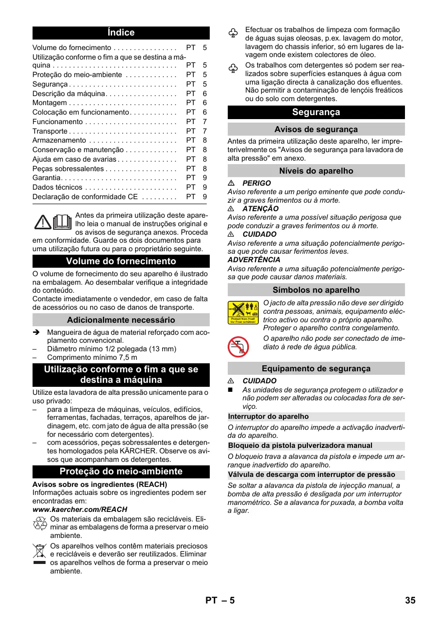 EN 60335–2–79 EN 61000–3–2: 2006+A1: 2009+A2: 2009 EN 61000–3–3: 2013 EN 62233: 2008 Procedimiento de evaluación de la conformidad aplicado 2000/14/CE: Anexo V Nivel de potencia acústica dB(A) Medido: 87 Garantizado: à rede 5 Local de armazenamento para mangueira de alta pressão 6 Alça de transporte 7 Conexão de água com peneira incorporada 8 Mangueira de aspiração do detergente com filtro de detergente e tampa 9 Reservatório de detergente 10 Peça de acoplamento para ligação da água 11 Local de armazenamento para lança 12 Local de armazenamento da pistola pulverizadora manual 13 Cabo de ligação à rede com ficha de rede 14 Roda de transporte 15 Pistola de injecção manual 16 Bloqueio da pistola pulverizadora manual 17 Botão para separar a mangueira de alta pressão da pistola pulverizadora manual 18 Mangueira de alta pressão EN 60335–1 EN 60335–2–79 EN 61000–3–2: 2006+A1: 2009+A2: 2009 EN 61000–3–3: 2013 EN 62233: 2008 Processo aplicado de avaliação de conformidade 2000/14/CE: Anexo V Nível de potência acústica dB(A) Medido: 87 EN 60335–1 EN 60335–2–79 EN 61000–3–2: 2006+A1: 2009+A2: 2009 EN 61000–3–3: 2013 EN 62233: 2008 Anvendte overensstemmelsesvurderingsprocedurer 2000/14/EF: Bilag V Lydeffektniveau dB(A) Målt: EN 60335–1 EN 60335–2–79 EN 61000–3–2: 2006+A1: 2009+A2: 2009 EN 61000–3–3: 2013 EN 62233: 2008 Anvendt metode for samsvarsvurdering 2000/14/EF: Vedlegg V Lydeffektnivå dB(A) Målt: EN 60335–1 EN 60335–2–79 EN 61000–3–2: 2006+A1: 2009+A2: 2009 EN 61000–3–3: 2013 EN 62233: 2008 Tillämpad metod för överensstämmelsevärdering 2000/14/EG: Bilaga V Ljudeffektsnivå dB(A) Upmätt: EN 60335–1 EN 60335–2–79 EN 61000–3–2: 2006+A1: 2009+A2: 2009 EN 61000–3–3: 2013 EN 62233: 2008 Sovellettu yhdenmukaisuuden analysointimenetelmä 2000/14/EY: Liite V Äänen tehotaso dB(A) EN 60335–1 EN 60335–2–79 EN 61000–3–2: 2006+A1: 2009+A2: 2009 EN 61000–3–3: 2013 EN 62233: 2008 Εφαρμοσθείσα διαδικασία συμμόρφωσης 2000/14/EΚ: Παράρτημα V στάθμη ηχητικής πίεσης dB(A) EN 60335–1 EN 60335–2–79 EN 61000–3–2: 2006+A1: 2009+A2: 2009 EN 61000–3–3: 2013 EN 62233: 2008 Kullanılan uyumluluk değerlendirme yöntemleri 2000/14/EG: Ek V Ses şiddeti dB(A) Ölçülen: 87 EN 60335–1 EN 60335–2–79 EN 61000–3–2: 2006+A1: 2009+A2: 2009 EN 61000–3–3: 2013 EN 62233: 2008 Примененный порядок оценки соответствия 2000/14/ЕС: Приложение V Уровень мощности звука dB(A) EN 60335–1 EN 60335–2–79 EN 61000–3–2: 2006+A1: 2009+A2: 2009 EN 61000–3–3: 2013 EN 62233: 2008 Követett megfelelés megállapítási eljárás: 2000/14/EK: V. függelék Hangteljesítményszint dB(A) EN 60335–1 EN 60335–2–79 EN 61000–3–2: 2006+A1: 2009+A2: 2009 EN 61000–3–3: 2013 EN 62233: 2008 Použitý postup posuzování shody: 2000/14/ES: Příloha V Hladinu akustického dB(A) Namerenou: EN 60335–1 EN 60335–2–79 EN 61000–3–2: 2006+A1: 2009+A2: 2009 EN 61000–3–3: 2013 EN 62233: 2008 Postopek ocenjevanja skladnosti: 2000/14/ES: Priloga V Raven zvočne moči dB(A) Izmerjeno: EN 60335–1 EN 60335–2–79 EN 61000–3–2: 2006+A1: 2009+A2: 2009 EN 61000–3–3: 2013 EN 62233: 2008 Zastosowana metoda oceny zgodności 2000/14/WE: Załącznik V Poziom mocy akustycznej dB(A) Zmierzony: Trepte de pericol PERICOL Indicaţie referitoare la un pericol iminent, care duce la vătămări corporale grave sau moarte. 몇 AVERTIZARE Indicaţie referitoare la o posibilă situaţie periculoasă, care ar putea duce la vătămări corporale grave sau moarte. 몇 PRECAUŢIE Indică o posibilă situaţie periculoasă, care ar putea duce la vătămări corporale uşoare. ATENŢIE Indicaţie referitoare la o posibilă situaţie periculoasă, care ar putea duce la pagube materiale. 14 Roată de transport 15 Pistol de pulverizare 16 Zăvor pistol de pulverizat 17 Buton de detaşare a furtunului de înaltă presiune de pistolul de pulverizat 18 Furtun de înaltă presiune 19 Lance cu reglaj de presiune (Vario Power) Pentru lucrările de curăţare uzuale. Presiunea de lucru poate fi reglată fără trepte între „Min” şi „Max”. În poziţia „Min” puteţi adăuga soluţia de curăţat. Pentru reglarea presiunii de lucru, eliberaţi maneta pistolului manual de stropit şi rotiţi lancea în poziţia dorită. şi se spală sub jet de apă. Evacuarea aerului din aparat: Porniţi aparatul cu furtunul de înaltă presiune deconectat şi lăsaţi-l să funcţioneze (max. 2 min.), până ce apa iese pe ieşirea de înaltă presiune fără a conţine bule de aer. Opriţi aparatul şi racordaţi furtunul de înaltă presiune.