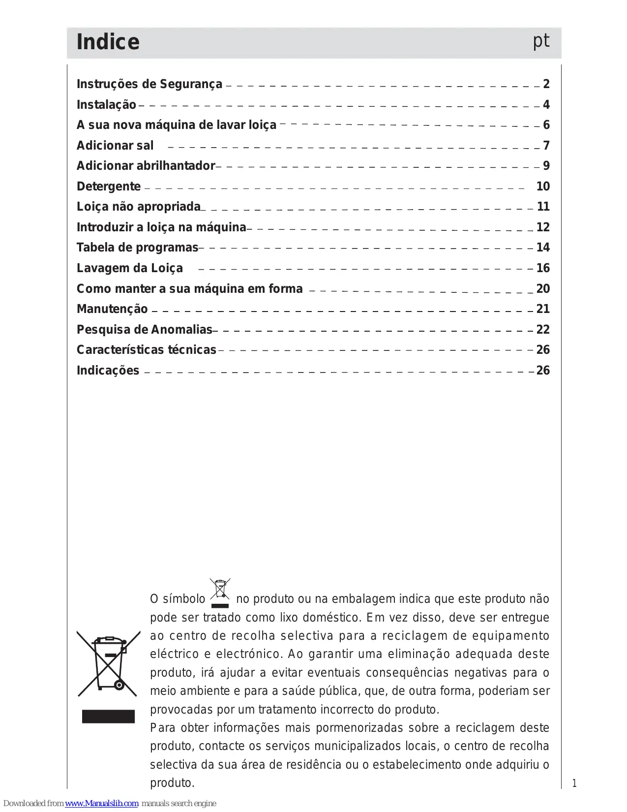 A máquina apenas deve ser utilizada por adultos para a lavagem de loiça doméstica e utensílios de cozinha. Este aparelho não deve ser instalado no exterior, ainda que o local esteja protegido por um telhado; também é perigoso deixá-lo exposto à chuva e aos agentes atmosféricos. Não se sentar ou apoiar na porta aberta. A máquina pode tombar. A água existente dentro da máquina não é água potável. Não colocar produtos solventes dentro da máquina. Perigo de explosão. Durante o programa de lavagem abrir a porta apenas se for com cuidado. Existe o perigo de a água sair da máquina. Não toque na resistência durante ou após um ciclo de lavagem. Após a instalação, deverá ser possível aceder facilmente à ficha de alimentação. Regras fundamentais relativas à utilização do aparelho: - Nunca toque na máquina de lavar loiça descalço ou com as mãos ou os pés molhados. - Não é aconselhável a utilização de extensões e tomadas múltiplas. - Se o aparelho não estiver a funcionar devidamente ou necessitar de manutenção, desligue-o da rede eléctrica. Downloaded from www.Manualslib.com manuals search engine