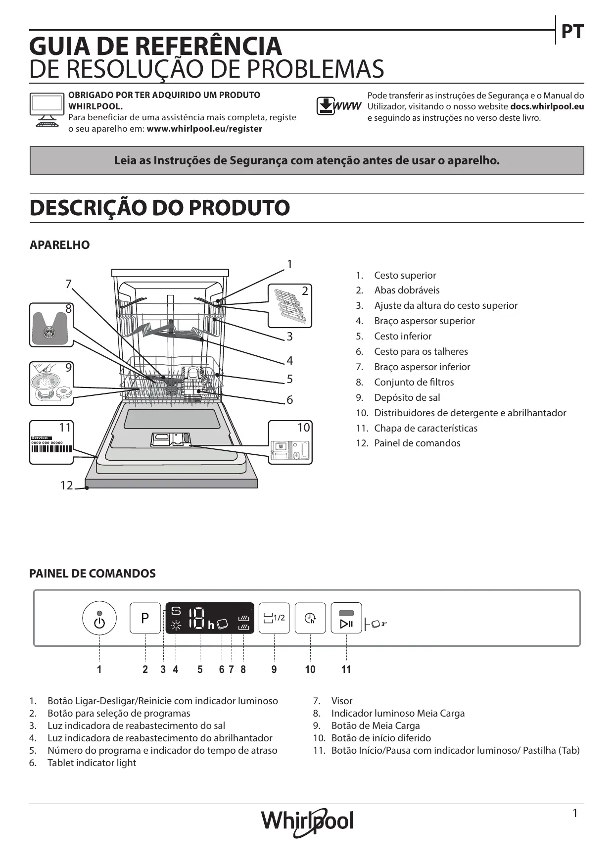 Pode transferir as instruções de Segurança e o Manual do Utilizador, visitando o nosso website docs.whirlpool.eu e seguindo as instruções no verso deste livro. Leia as Instruções de Segurança com atenção antes de usar o aparelho.