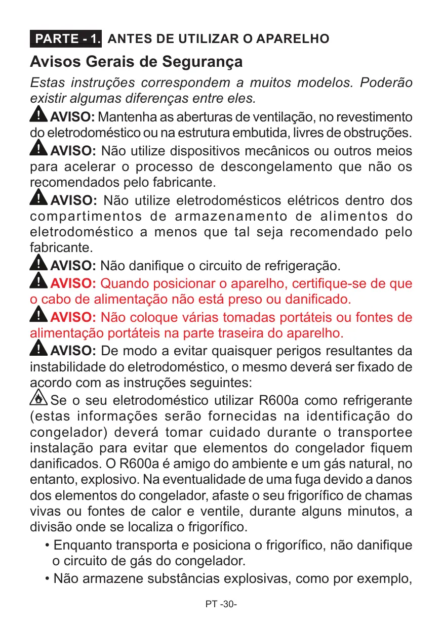 PT -29- PARTE - 1. ANTES DE UTILIZAR O APARELHO Avisos Gerais de Segurança Estas instruções correspondem a muitos modelos. Poderão existir algumas diferenças entre eles. AVISO: Mantenha as aberturas de ventilação, no revestimento do eletrodoméstico ou na estrutura embutida, livres de obstruções. AVISO: Não utilize dispositivos mecânicos ou outros meios para acelerar o processo de descongelamento que não os recomendados pelo fabricante. AVISO: Não utilize eletrodomésticos elétricos dentro dos compartimentos de armazenamento de alimentos do eletrodoméstico a menos que tal seja recomendado pelo fabricante. AVISO: Não danifique o circuito de refrigeração. AVISO: Quando posicionar o aparelho, certifique-se de que o cabo de alimentação não está preso ou danificado. AVISO: Não coloque várias tomadas portáteis ou fontes de alimentação portáteis na parte traseira do aparelho. AVISO: De modo a evitar quaisquer perigos resultantes da instabilidade do eletrodoméstico, o mesmo deverá ser fixado de acordo com as instruções seguintes: Se o seu eletrodoméstico utilizar R600a como refrigerante (estas informações serão fornecidas na identificação do congelador) deverá tomar cuidado durante o transportee instalação para evitar que elementos do congelador fiquem danificados. O R600a é amigo do ambiente e um gás natural, no entanto, explosivo. Na eventualidade de uma fuga devido a danos dos elementos do congelador, afaste o seu frigorífico de chamas vivas ou fontes de calor e ventile, durante alguns minutos, a divisão onde se localiza o frigorífico.