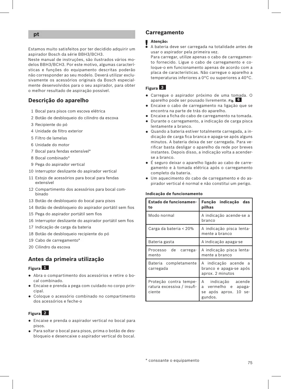 Estamos muito satisfeitos por ter decidido adquirir um aspirador Bosch da série BBH3/BCH3. Neste manual de instruções, são ilustrados vários modelos BBH3/BCH3. Por este motivo, algumas características e funções do equipamento descritas poderão não corresponder ao seu modelo. Deverá utilizar exclusivamente os acessórios originais da Bosch especialmente desenvolvidos para o seu aspirador, para obter o melhor resultado de aspiração possível. Descrição do aparelho 1 Bocal para pisos com escova elétrica 2 Botão de desbloqueio do cilindro da escova 3 Recipiente do pó 4 Unidade de filtro exterior Carregamento