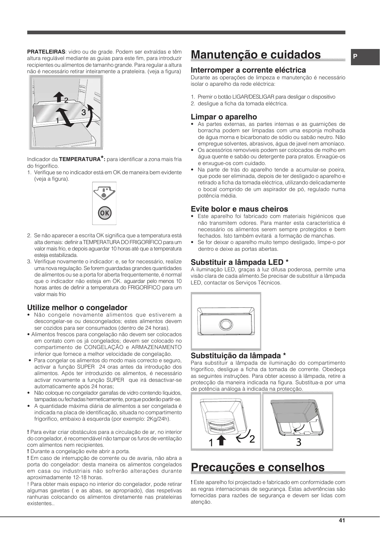 • Les aliments frais à congeler ne doivent pas se mélanger aux aliments déjà congelés. Ils doivent être placés dans la partie inférieure du CONGÉLATEUR et dans le compartiment de STOCKAGE. • Pour congeler les aliments correctement et en toute sécurité, il faut activer la fonction SUPER 24 heures avant d’introduire les aliments. Après avoir introduit les aliments, il faudra activer à nouveau la fonction SUPER qui se déclenchera automatiquement après les 24 heures; • Ne stockez pas dans votre congélateur des bouteilles en verre contenant des liquides, bouchées ou fermées hermétiquement, elles pourraient se briser. • La quantité journalière maximale d’aliments pouvant être congelée est indiquée sur l’étiquette des caractéristiques,