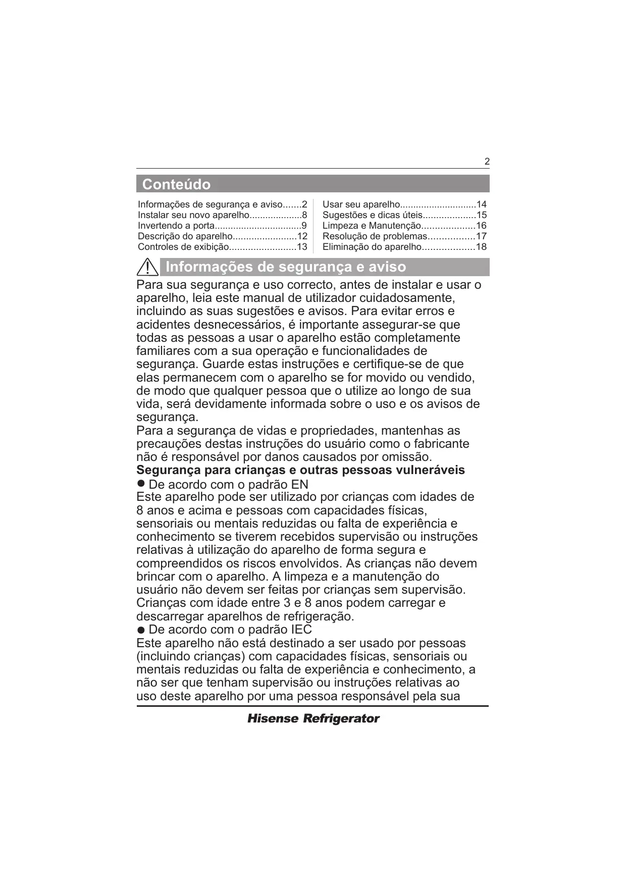 - Eliminação do aparelho Informações de segurança e aviso Para sua segurança e uso correcto, antes de instalar e usar o aparelho, leia este manual de utilizador cuidadosamente, incluindo as suas sugestões e avisos. Para evitar erros e acidentes desnecessários, é importante assegurar-se que todas as pessoas a usar o aparelho estão completamente familiares com a sua operação e funcionalidades de segurança. Guarde estas instruções e certifique-se de que elas permanecem com o aparelho se for movido ou vendido, de modo que qualquer pessoa que o utilize ao longo de sua vida, será devidamente informada sobre o uso e os avisos de segurança. Para a segurança de vidas e propriedades, mantenhas as precauções destas instruções do usuário como o fabricante não é responsável por danos causados por omissão. Segurança para crianças e outras pessoas vulneráveis ● De acordo com o padrão EN Este aparelho pode ser utilizado por crianças com idades de 8 anos e acima e pessoas com capacidades físicas, sensoriais ou mentais reduzidas ou falta de experiência e conhecimento se tiverem recebidos supervisão ou instruções relativas à utilização do aparelho de forma segura e compreendidos os riscos envolvidos. As crianças não devem brincar com o aparelho. A limpeza e a manutenção do usuário não devem ser feitas por crianças sem supervisão. Crianças com idade entre 3 e 8 anos podem carregar e descarregar aparelhos de refrigeração. ● De acordo com o padrão IEC Este aparelho não está destinado a ser usado por pessoas (incluindo crianças) com capacidades físicas, sensoriais ou mentais reduzidas ou falta de experiência e conhecimento, a não ser que tenham supervisão ou instruções relativas ao uso deste aparelho por uma pessoa responsável pela sua p. 18