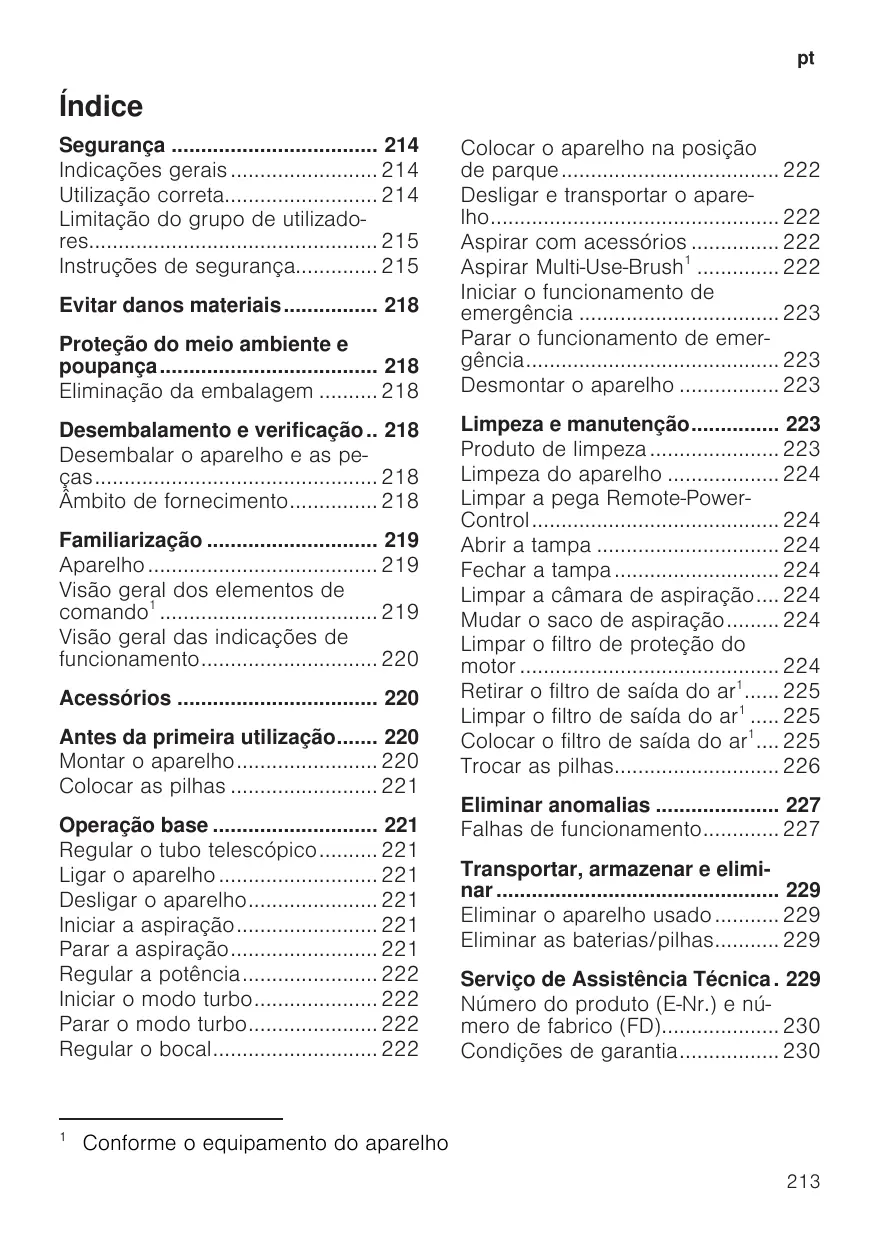 | A potência de aspiração di-minui. | O FILTER de saída do ar está sujo. | • Limpe o FILTER de saída do ar. → "Limpar o FILTER de saída do ar1", Págnina 225 |