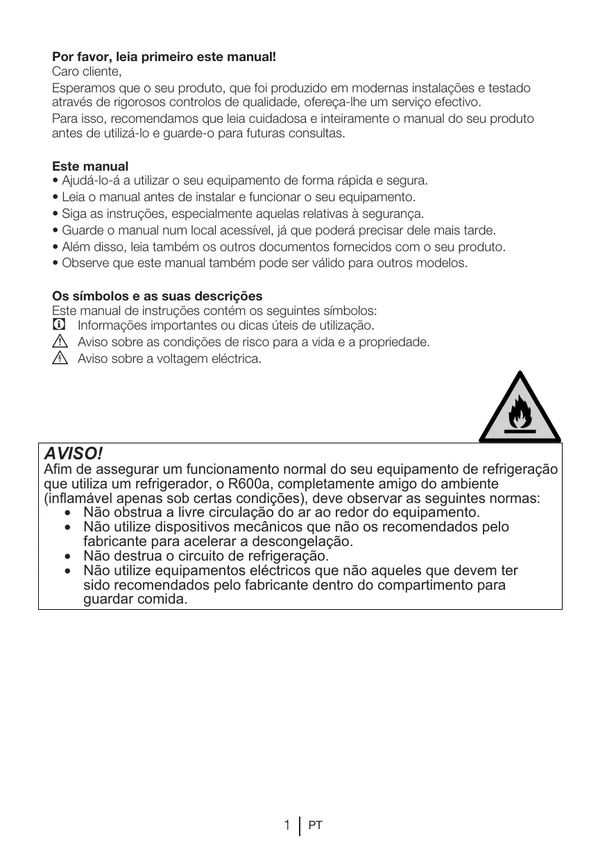 Afim de assegurar um funcionamento normal do seu equipamento de refrigeração que utiliza um refrigerador, o R600a, completamente amigo do ambiente (inflamável apenas sob certas condições), deve observar as seguintes normas: • Não obstrua a livre circulação do ar ao redor do equipamento. • Não utilize dispositivos mecânicos que não os recomendados pelo fabricante para acelerar a descongelação. • Não destrua o circuito de refrigeração. • Não utilize equipamentos eléctricos que não aqueles que devem ter sido recomendados pelo fabricante dentro do compartimento para guardar comida.