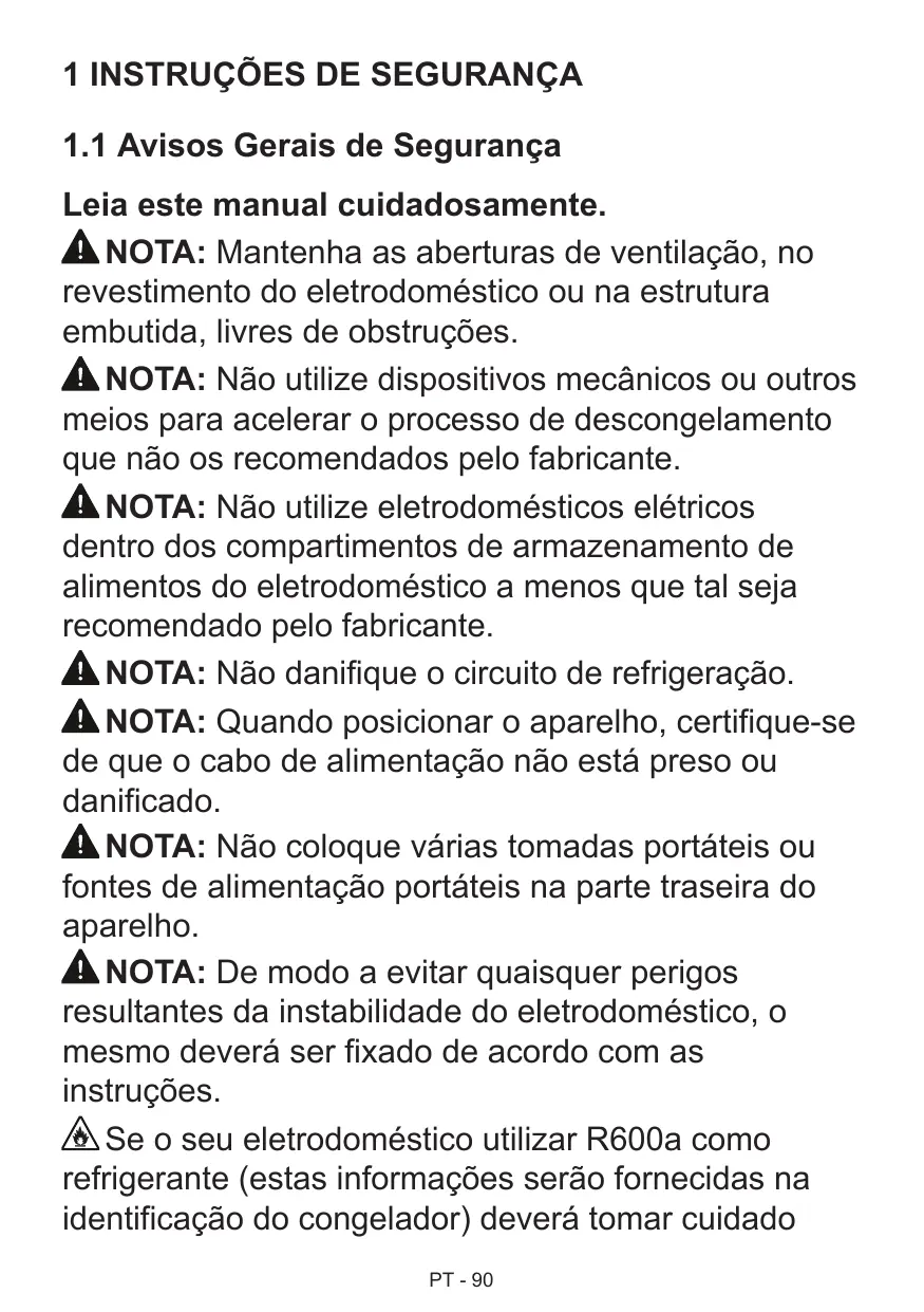 MISE EN GARDE: Ne pas utiliser de dispositifs mécaniques ou autres moyens pour accélérer le processus de dégivrage autres que ceux recommandés par le fabricant. MISE EN GARDE: Ne pas utiliser d'appareils électriques à l'intérieur du compartiment de stockage des denrées, à moins qu'ils ne soient du type recommandé par le fabricant. MISE EN GARDE: Ne pas endommager le circuit de réfrigération. AVERTISSEMENT: Lors du positionnement de l’appareil, s’assurer que le cordon d’alimentation n’est pas coincé ni endommagé. AVERTISSEMENT: Ne pas placer de socles mobiles de prises multiples ni de blocs d’alimentation portables à l’arrière de l’appareil. MISE EN GARDE: Pour éviter tout risque dû à l'instabilité de l'appareil, celui-ci doit être fixé conformément aux instructions suivantes : FR - 3