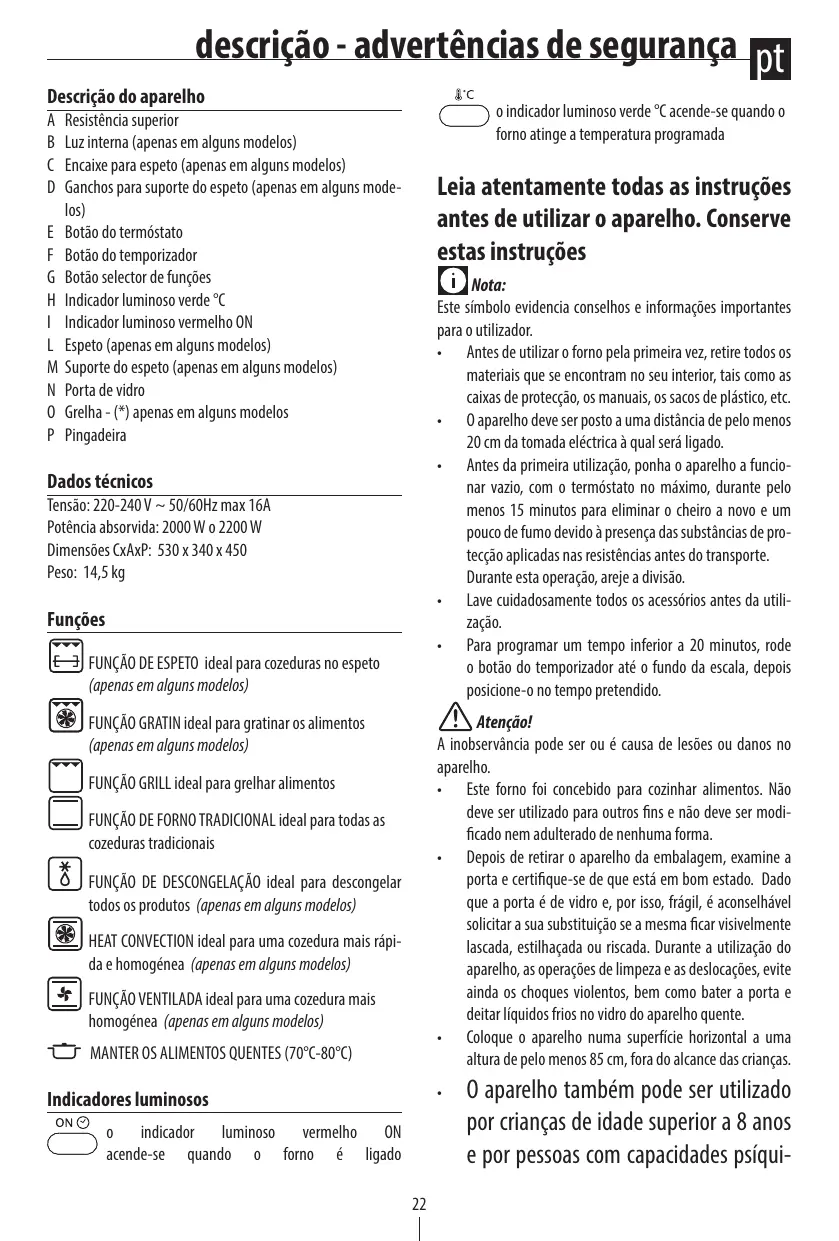 • L’appareil doit être placé à 20 cm au moins de la prise électrique sur laquelle il est branché. • Avant la première utilisation, faites fonctionner l’appareil à vide, thermostat au maximum, pendant au moins 15 minutes pour éliminer l’odeur de neuf et éventuellement la fumée due aux graisses de protection appliquées sur les résistances avant le transport. Pendant cette opération, aérez la pièce. • Lavez soigneusement tous les accessoires avant l’utilisation. • Pour programmer des temps inférieurs à 20 minutes, tourner d’abord le bouton minuterie à fond puis la positionner sur le temps souhaité.