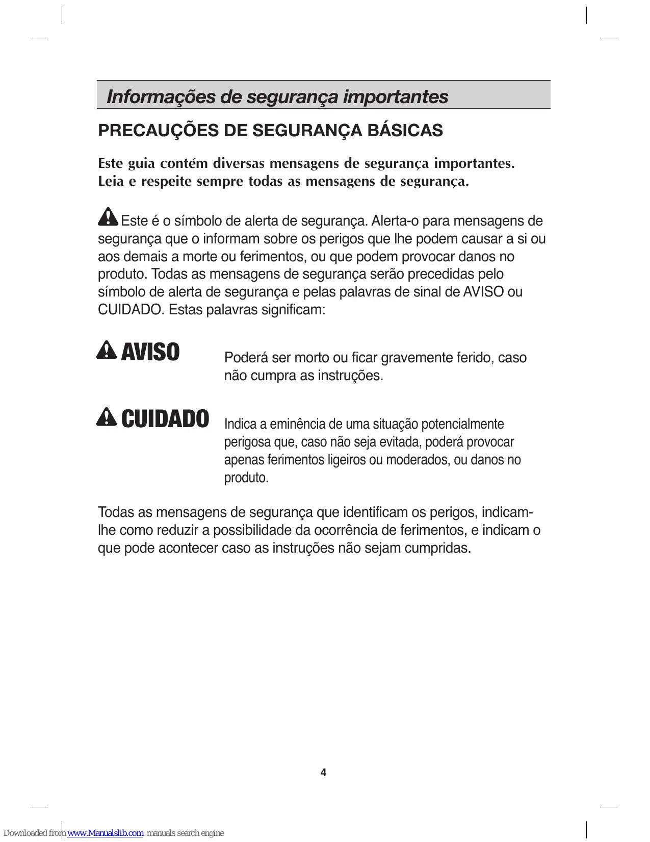 Informações de segurança importantes PRECAUÇÕES DE SEGURANÇA BÁSICAS Este guia contém diversas mensagens de segurança importantes. Leia e respeite sempre todas as mensagens de segurança. Este é o símbolo de alerta de segurança. Alerta-o para mensagens de segurança que o informam sobre os perigos que lhe podem causar a si ou aos demais a morte ou ferimentos, ou que podem provocar danos no produto. Todas as mensagens de segurança serão precedidas pelo símbolo de alerta de segurança e pelas palavras de sinal de AVISO ou CUIDADO. Estas palavras significam: