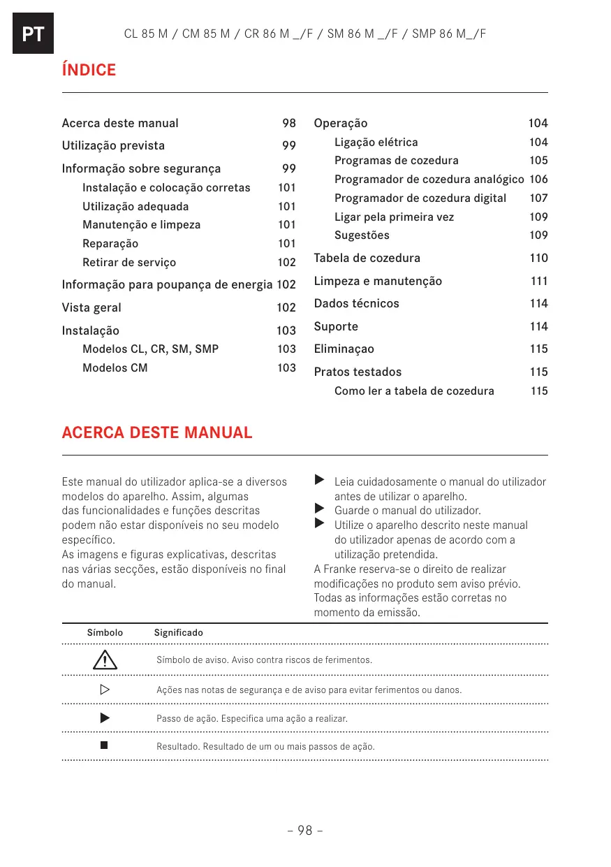 Encontre gratuitamente o manual do aparelho CL 85 M PW FRANKE em formato PDF.