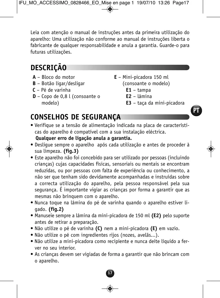 Cualquier error de conexión anularía la garantía. • Desconecte siempre su aparato si lo deja sin vigilancia, cuando lo desmonta o durante su mantenimiento. (fig.3) • Este aparato no está previsto para ser utilizado por personas (incluido los niños) cuyas capacidades físicas, sensoriales o mentales son reducidas, o por personas privadas de experiencia o de conocimiento, excepto si pudieran beneficiarse, por medio de otra persona responsable de su seguridad, de una vigilancia o de instrucciones previas concernientes a la utilización del aparato. • Conviene vigilar a los niños para asegurarse que no jueguen con el aparato. • Nunca manipule la cuchilla del pie mezclador si el aparato está enchufado. (fig.2) • Manipule siempre la cuchilla de la mini-picadora 150 ml (E2) por su base antes de tomar su preparación. • Nunca haga funcionar el pie mezclador (C) y la mini-picadora (E) en vacío. • Nunca haga funcionar el pie mezclador con ingredientes secos ( nueces, avellanas...). • No utilice la mini-picadora como recipiente y nunca vierta líquidos hirviendo en su interior. • Introduzca el pie de la batidora en la preparación, sumerja sólo la campana, ponga el aparato en marcha y deje que se vaya haciendo la preparación. • No es necesario machacar la preparación para obtener un buen resultado.