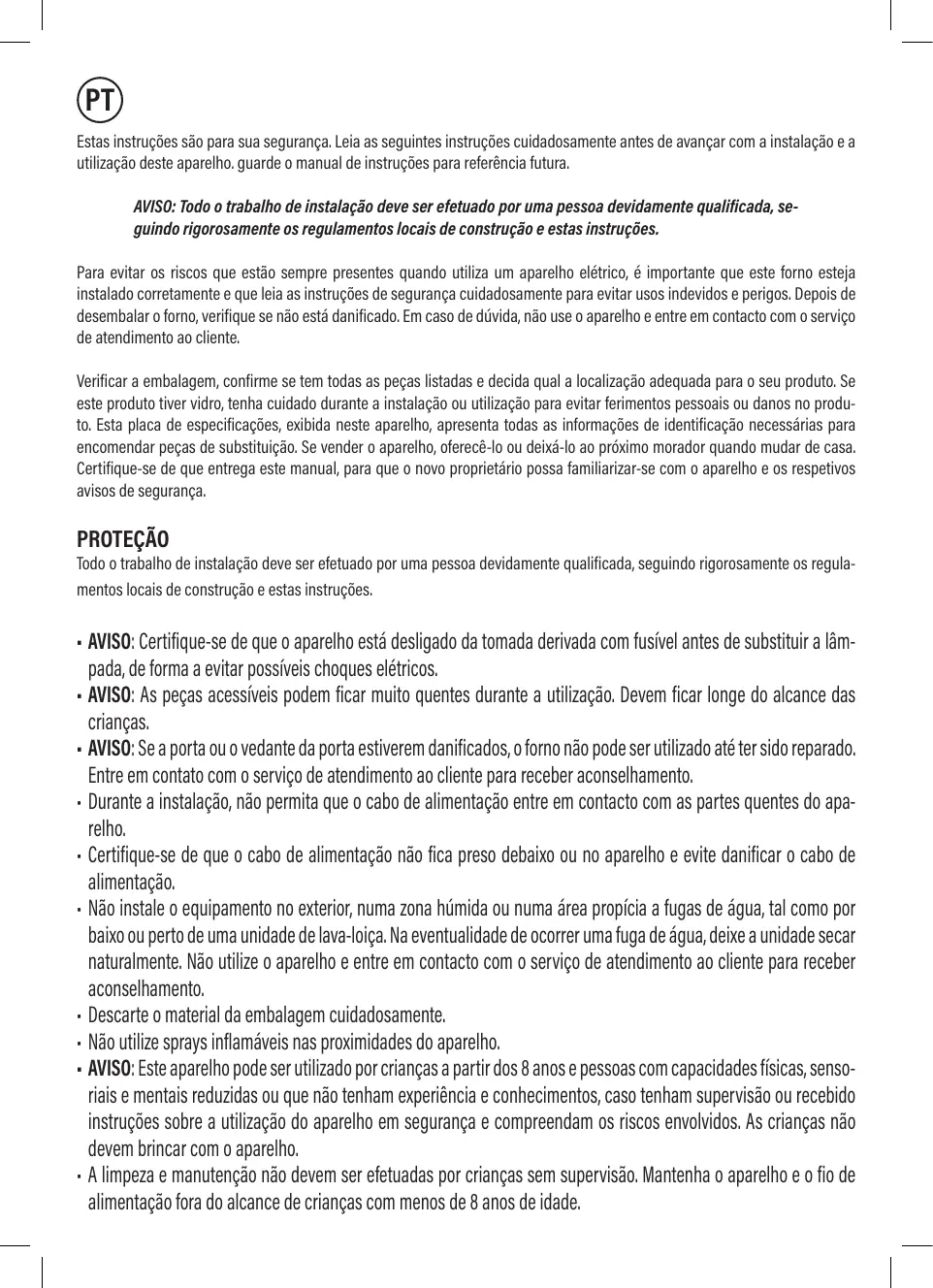 Estas instruções são para sua segurança. Leia as seguintes instruções cuidadosamente antes de avançar com a instalação e a utilização deste aparelho. guarde o manual de instruções para referência futura. AVISO: Todo o trabalho de instalação deve ser efetuado por uma pessoa devidamente qualificada, seguindo rigorosamente os regulamentos locais de construção e estas instruções. Para evitar os riscos que estão sempre presentes quando utiliza um aparelho elétrico, é importante que este forno esteja instalado corretamente e que leia as instruções de segurança cuidadosamente para evitar usos indevidos e perigos. Depois de desembalar o forno, verifique se não está danificado. Em caso de dúvida, não use o aparelho e entre em contacto com o serviço de atendimento ao cliente. Verificar a embalagem, confirme se tem todas as peças listadas e decida qual a localização adequada para o seu produto. Se este produto tiver vidro, tenha cuidado durante a instalação ou utilização para evitar ferimentos pessoais ou danos no produto. Esta placa de especificações, exibida neste aparelho, apresenta todas as informações de identificação necessárias para encomendar peças de substituição. Se vender o aparelho, oferecê-lo ou deixá-lo ao próximo morador quando mudar de casa. Certifique-se de que entrega este manual, para que o novo proprietário possa familiarizar-se com o aparelho e os respetivos avisos de segurança. PROTEÇÃO Todo o trabalho de instalação deve ser efetuado por uma pessoa devidamente qualificada, seguindo rigorosamente os regulamentos locais de construção e estas instruções.